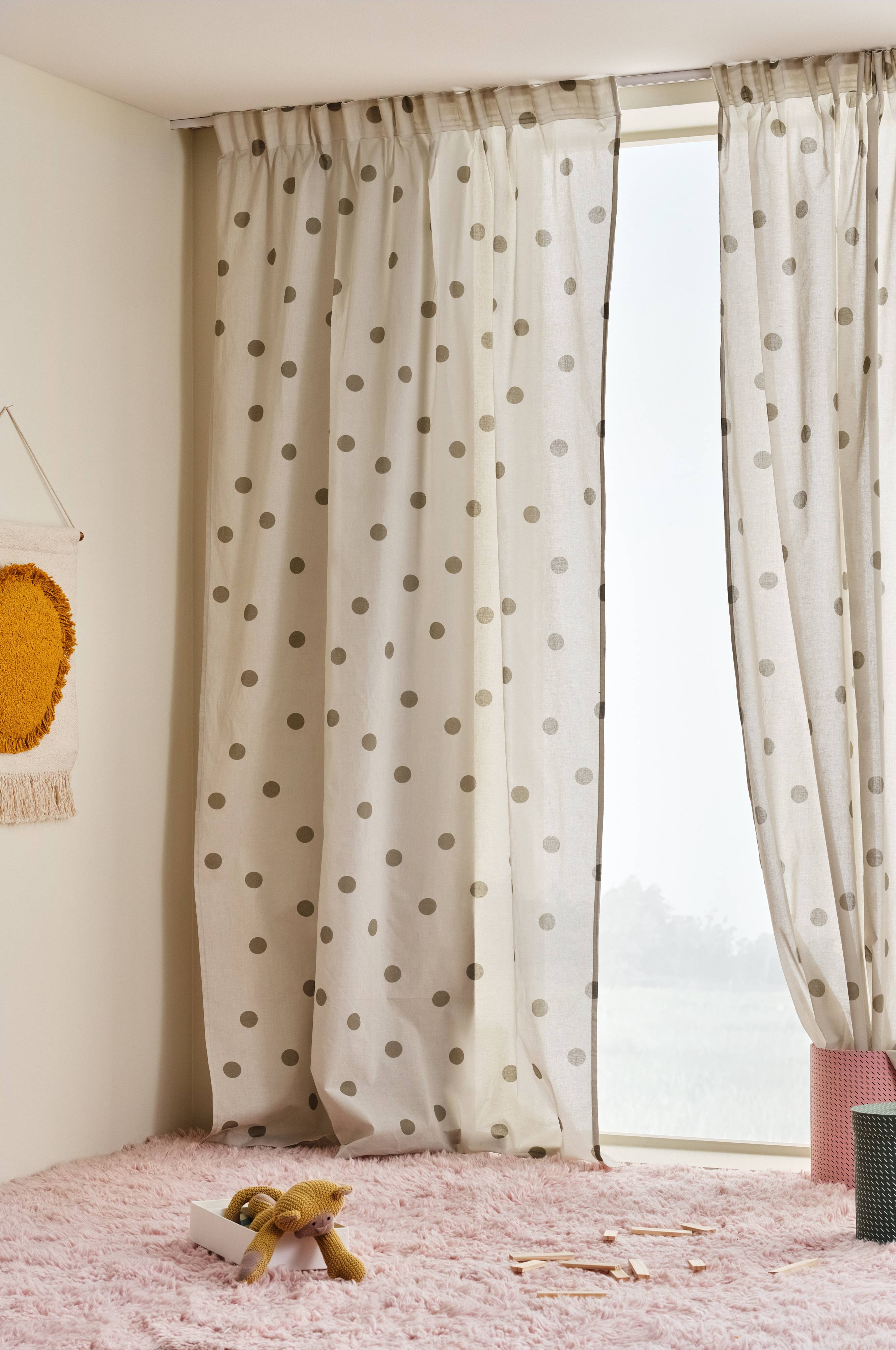 Kaksi puuvillaista sivuverhoa, joissa painettu, sointuvan värinen pilkkukuvio. Klassinen pilkullinen kuvio on aina muodissa. Verhoissa on päälleommeltu monitoiminauha, ja ne voidaan ripustaa sormikoukkujen, kujan tai piilolenkkien avulla.