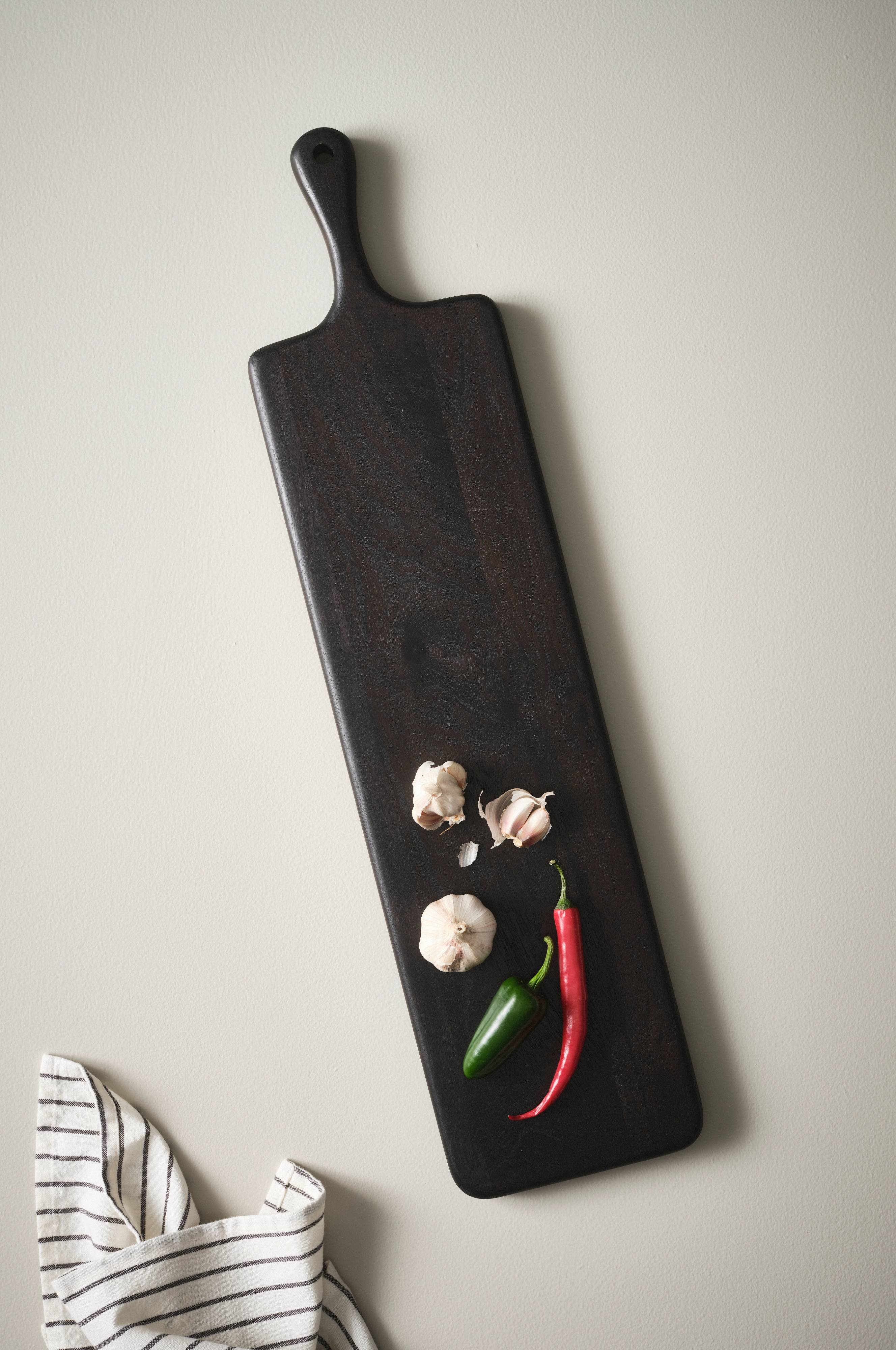 Leikkuulauta FSC-sertifioitua mangopuuta, jossa on kauns mustaksi käsitelty pinta. Tyylikkäästi muotoillussa leikkuulaudassa on pehmeästi pyöristetyt reunat ja kahvassa aukko, josta sen voi ripustaa keittiöön.