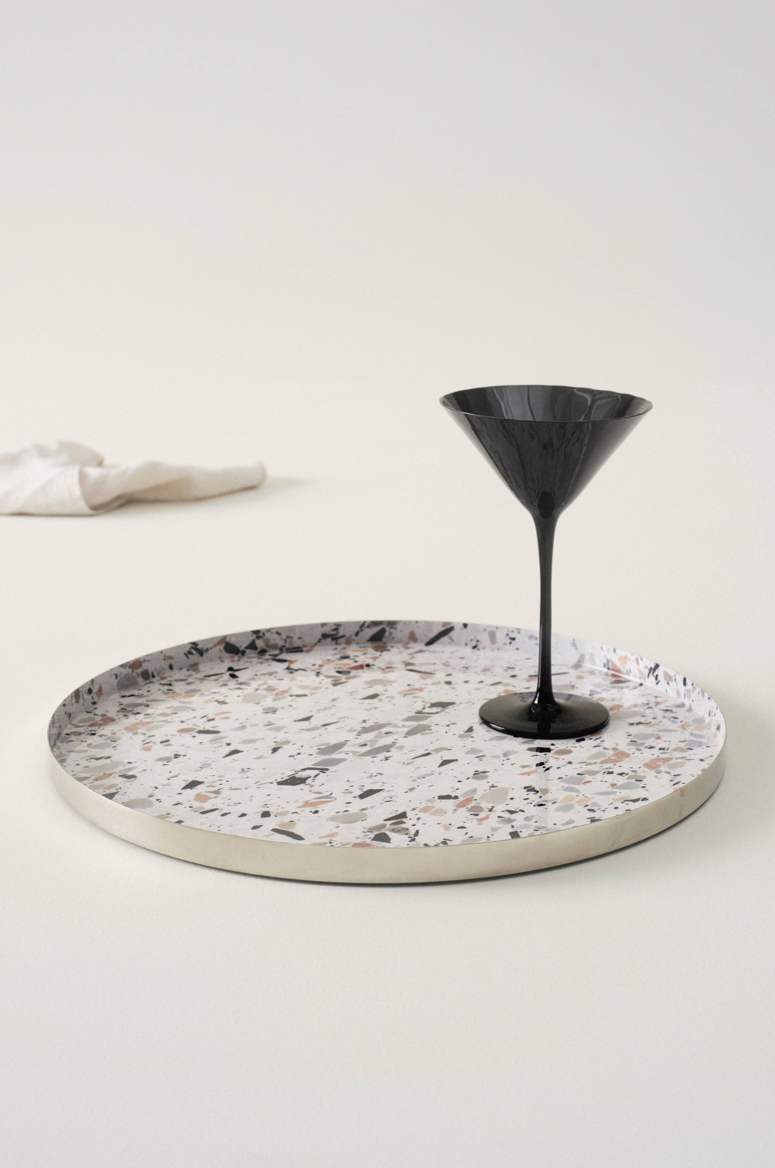Rautatarjotin, jossa emaloitu sisäpuoli ja upea roiskekuvio. Tarjottimessa on käytännöllinen reunus ympäriinsä.