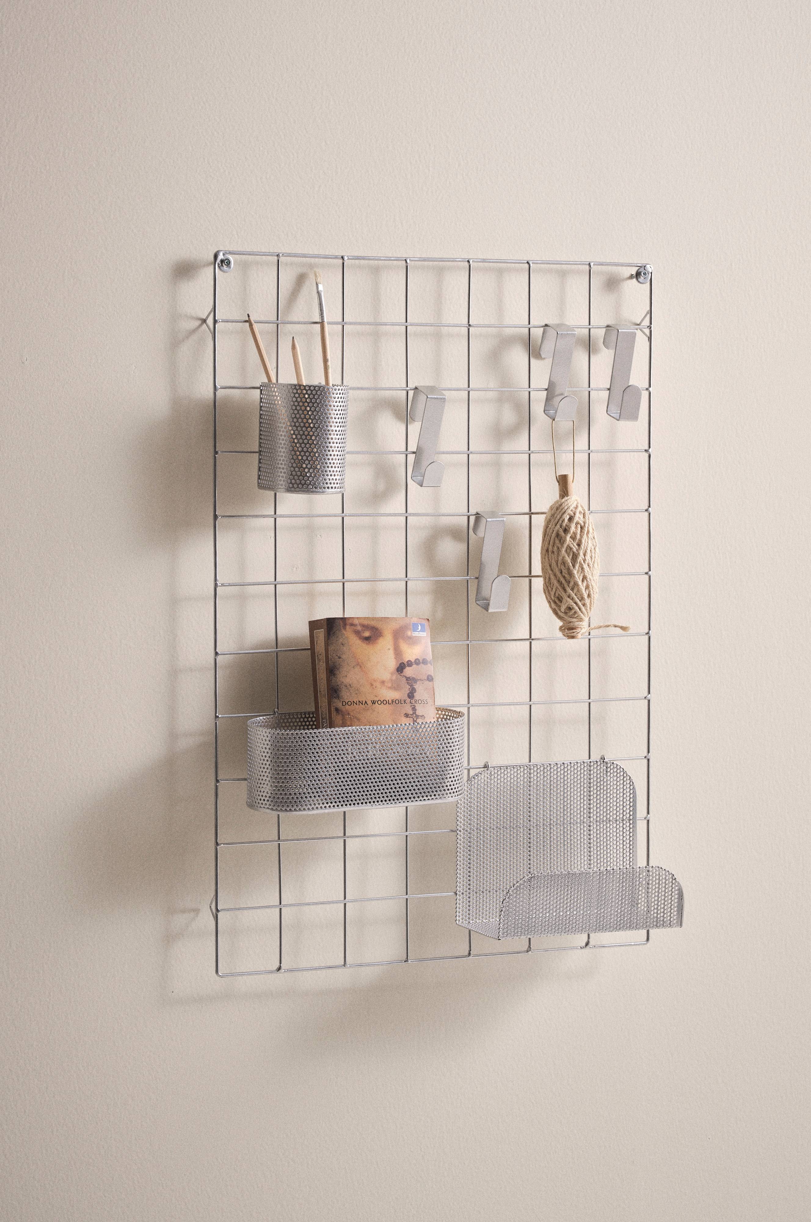 Seinäsäilytysratkaisu metallia. Kiinnitä verkko seinälle ja ripusta verkkoon mukana toimitettavat lokerot, pidike ja neljä koukkua. Kaikki osat ovat siirrettäviä, joten voit asetella ne haluamallasi tavalla. Käytännöllinen ja tyylikäs tapa pitää yllä järjestystä.