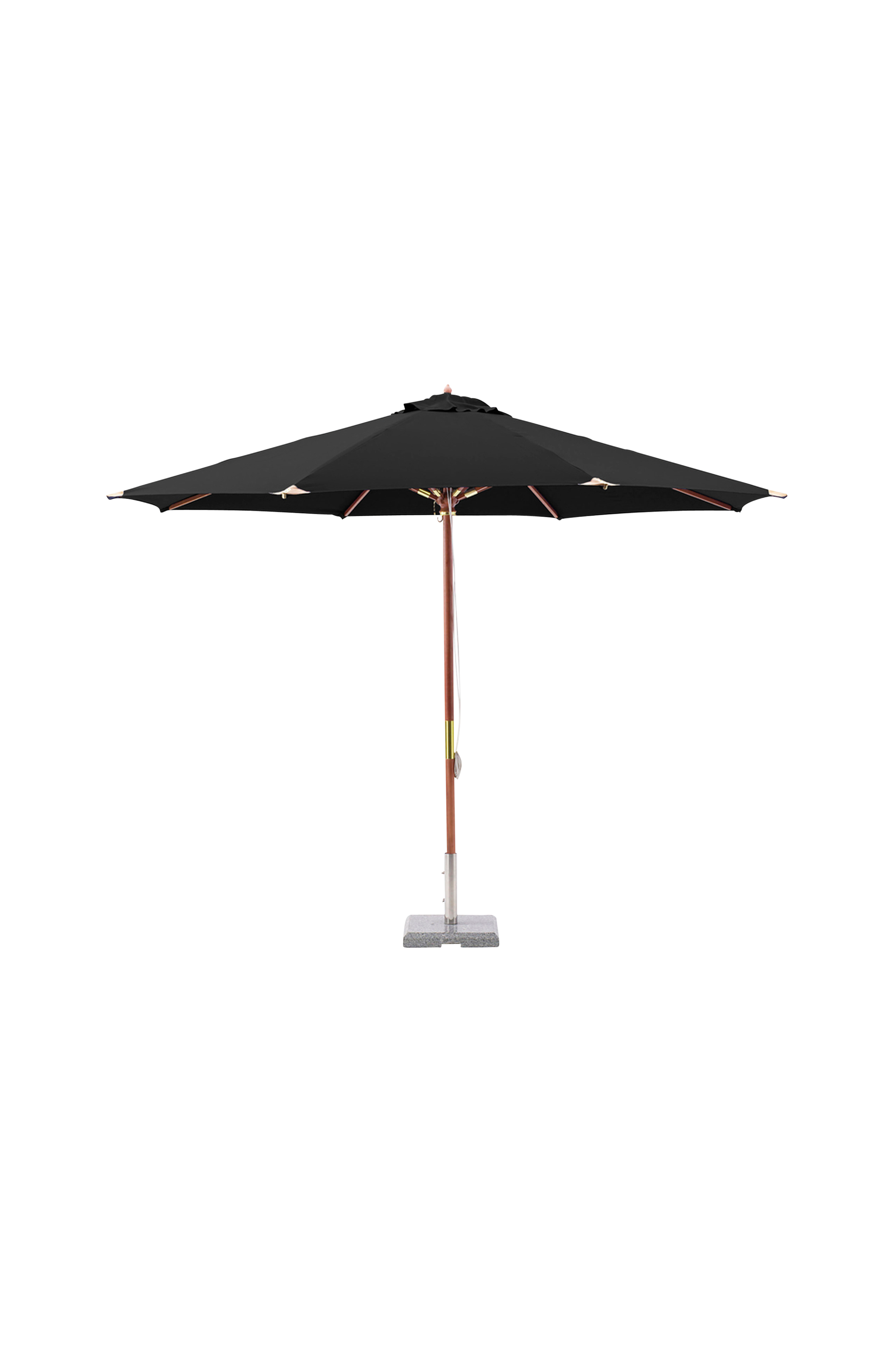 AURINKOVARJO puuta/mustaa polyesteriä. Halkaisija 335 cm.