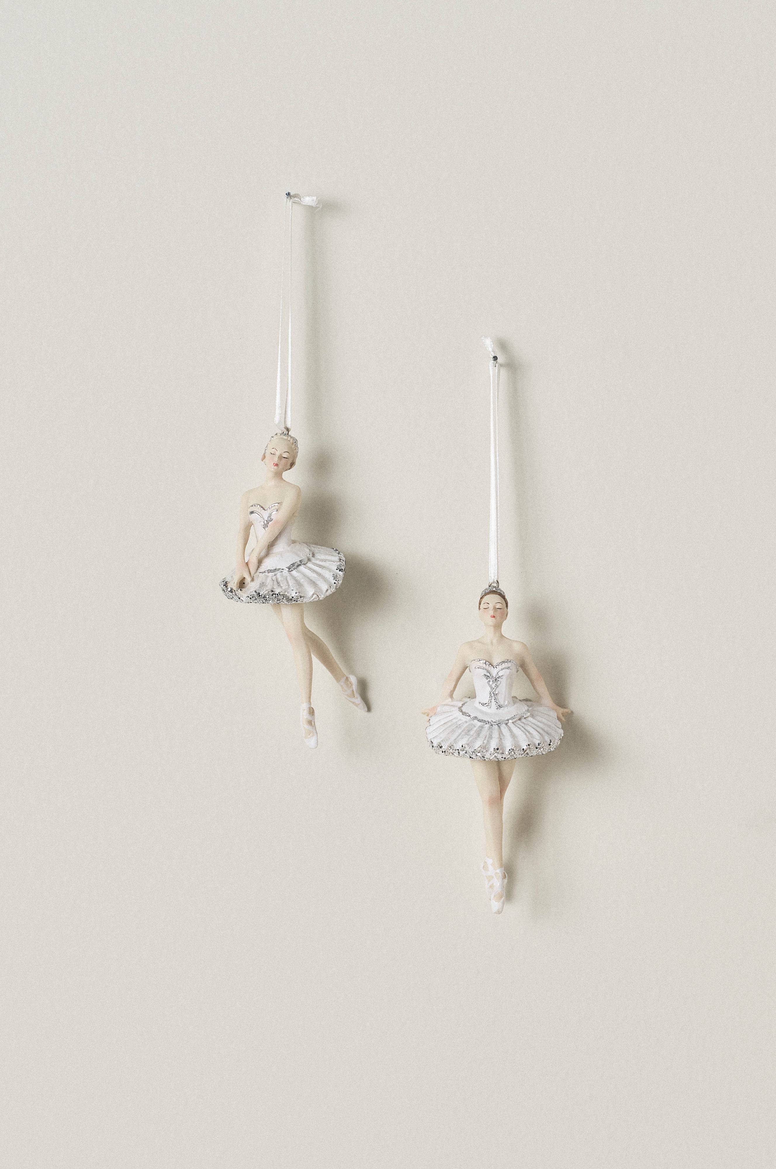 Kaksi kappaletta balettitanssijoita polyresiiniä. Hopean ja valkoisen hennot sävyt valaisevat joulukuusen.