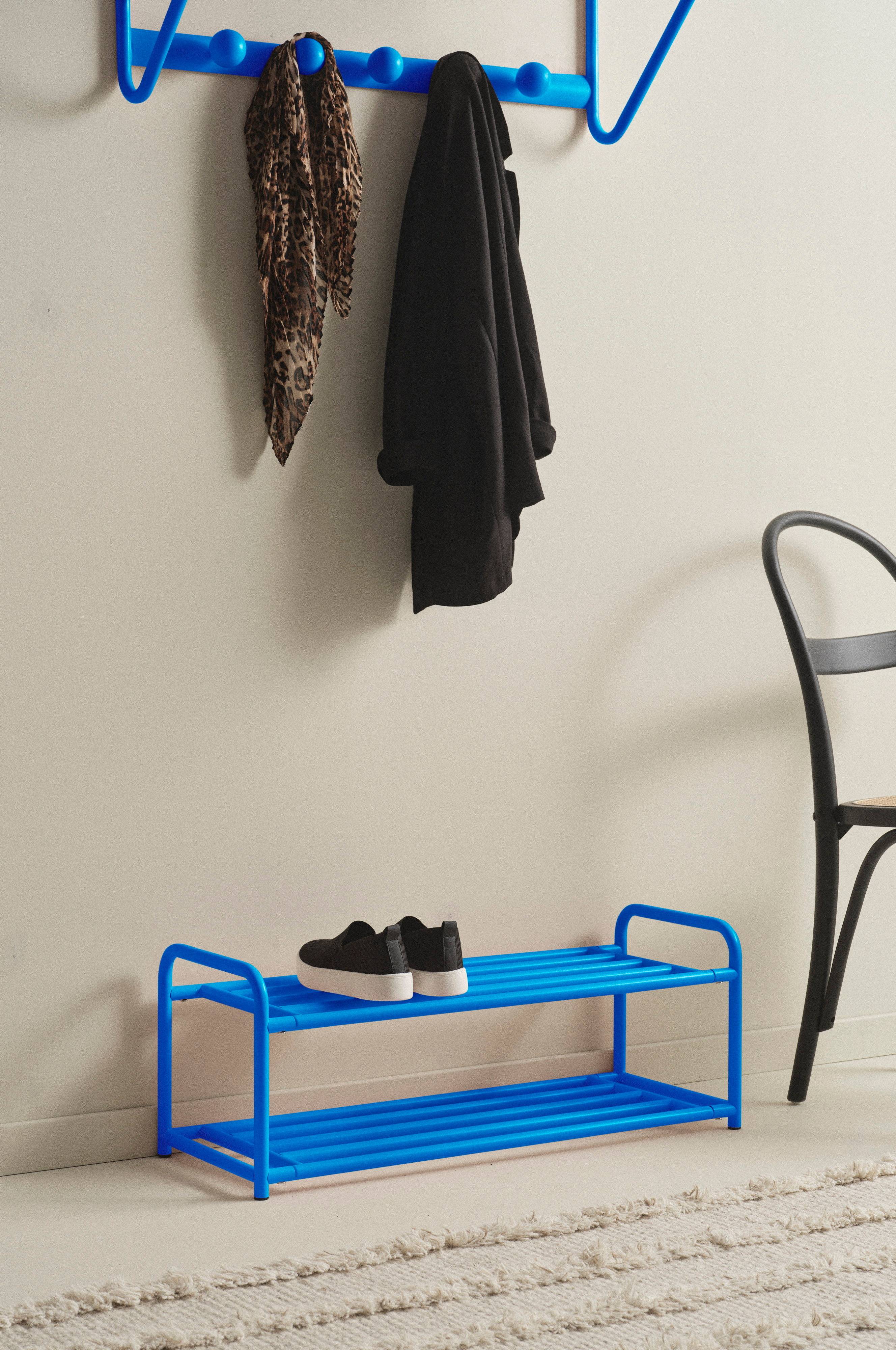Veikeä pyöreälinjainen kenkähylly, jossa kaksi hyllyä. Kenkähylly on jauhemaalattu. Osittain koottava. Kokoamisohje mukana.
