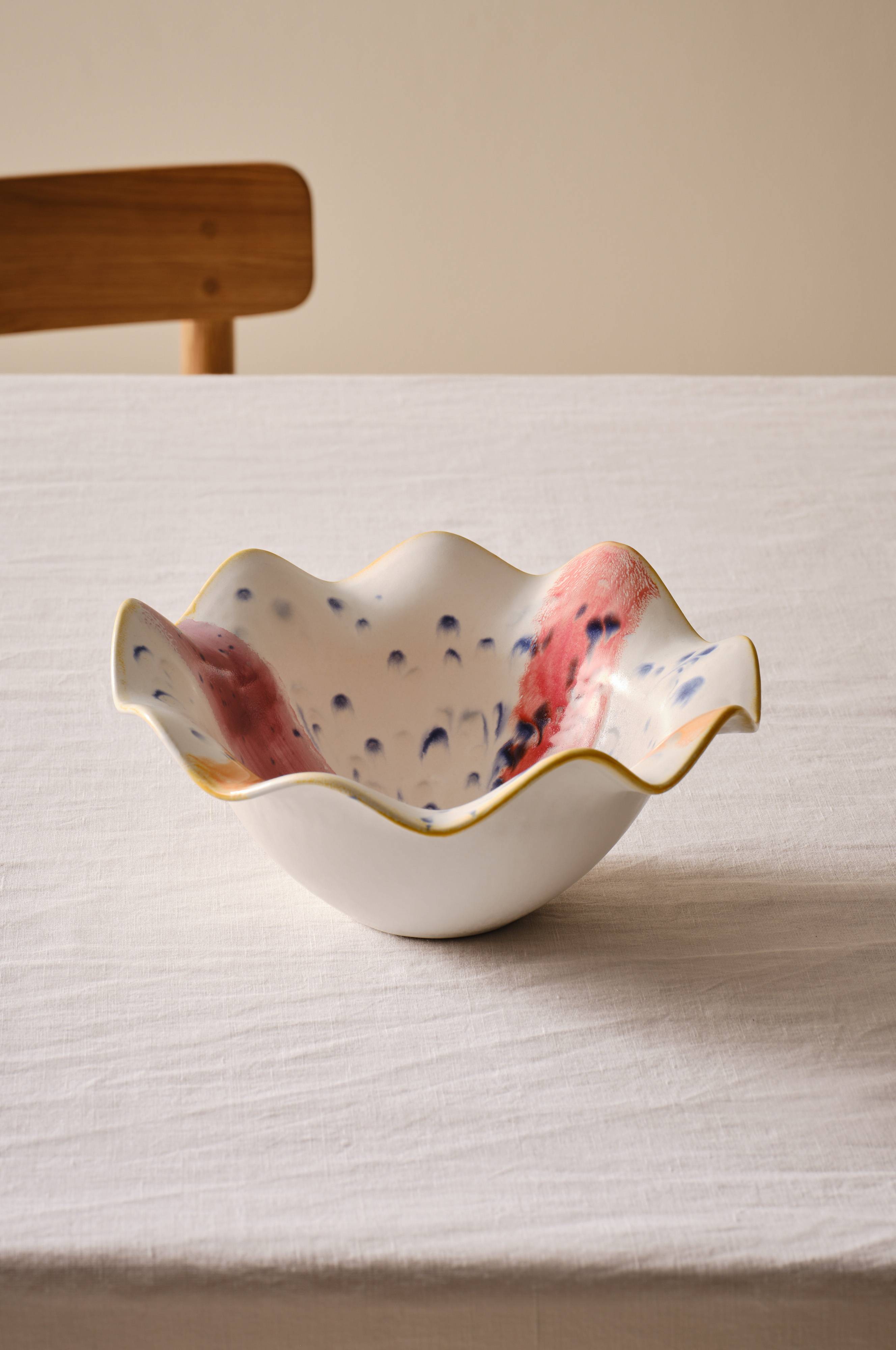 Aaltoreunaisessa keraamisessa kulhossa yhdistyvät taiteellisuus ja toiminnallisuus. Käsinmaalattu muotoilu esittelee mukavan kuvion eloisissa väreissä.