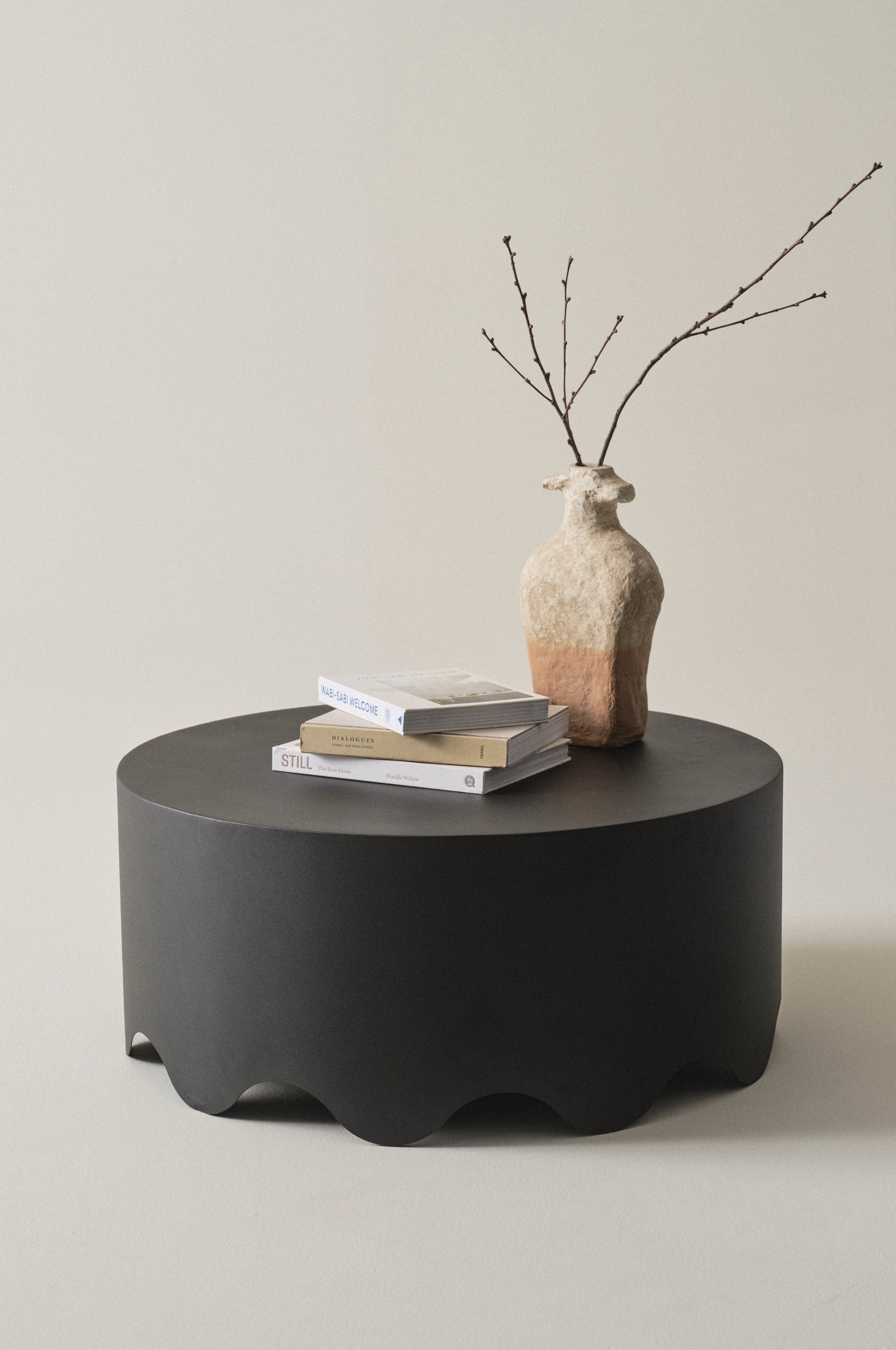 Pyöreä sohvapöytä rautaa. Upea aaltoileva alareuna. Jauhemaalattu mattapinta. Leikkisä pöytä, joka antaa energiaa kalustukseen. Mikäli sinulla on herkästi naarmuuntuva lattia, aseta huopatassut tai muu suoja huonekalun alle.