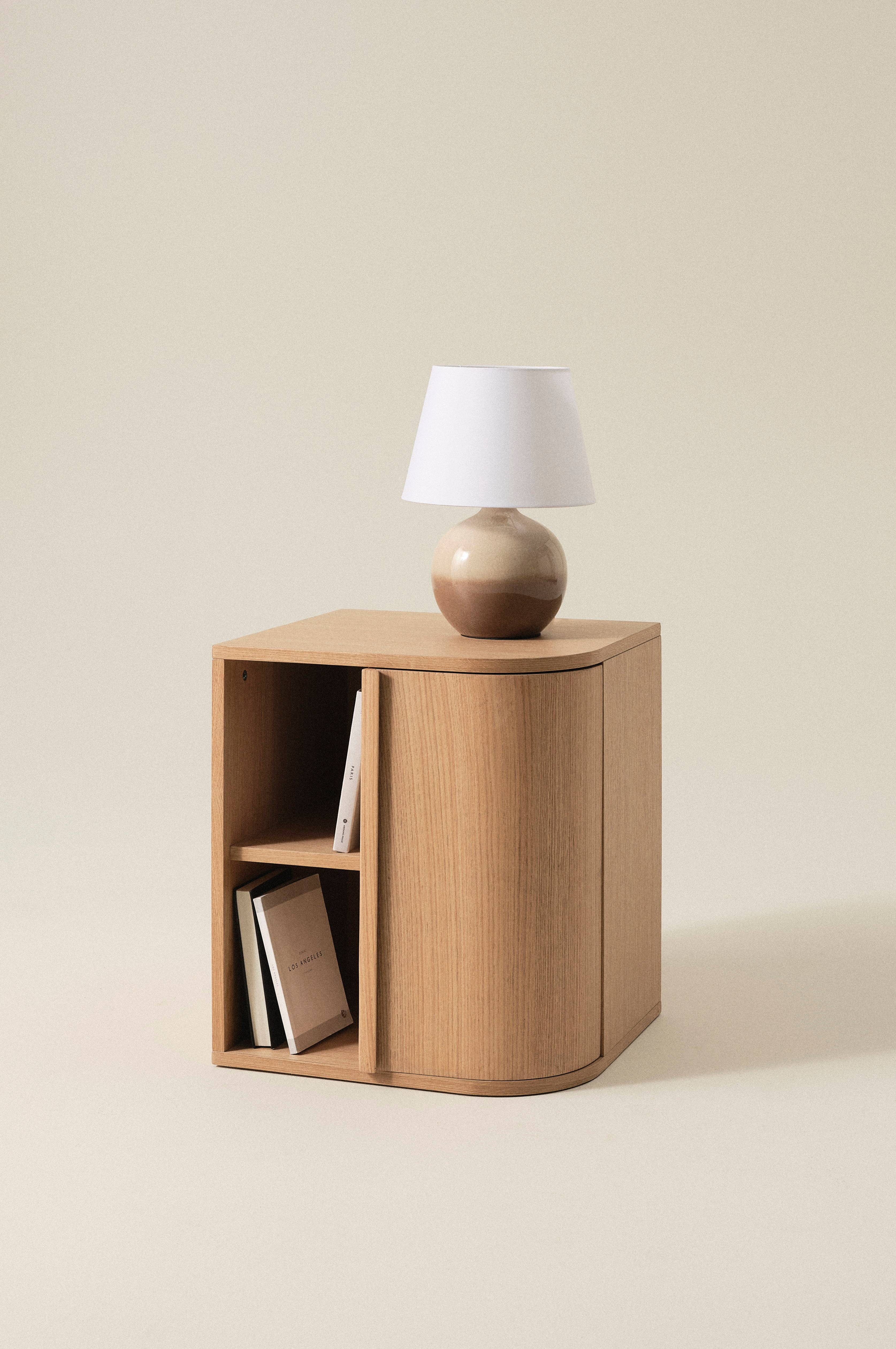 Yöpöytä MDF-levyä, jossa tammiviilua esillä olevilla pinnoilla. BRAUX on vankka yöpöytä, joka huokuu ylellisyyttä ja tyyliä. Etureunan pehmeästi pyöristetyt kulmat vahvistavat eleganttia ilmettä. BRAUX-yöpöydässä on syvä, pyöristetty ovi, jonka takana on säilytystila, ja sitä täydentää kaksi avohyllyä esineille, jotka haluat pitää helposti ulottuvilla. Oven takana on myös kiinteä hylly, joten yhteensä sinulla on neljä käytännöllistä säilytyslokeroa. Yöpöytä on käsitelty vesipohjaisella lakalla. Osittain koottava. Kokoamisohje mukana.