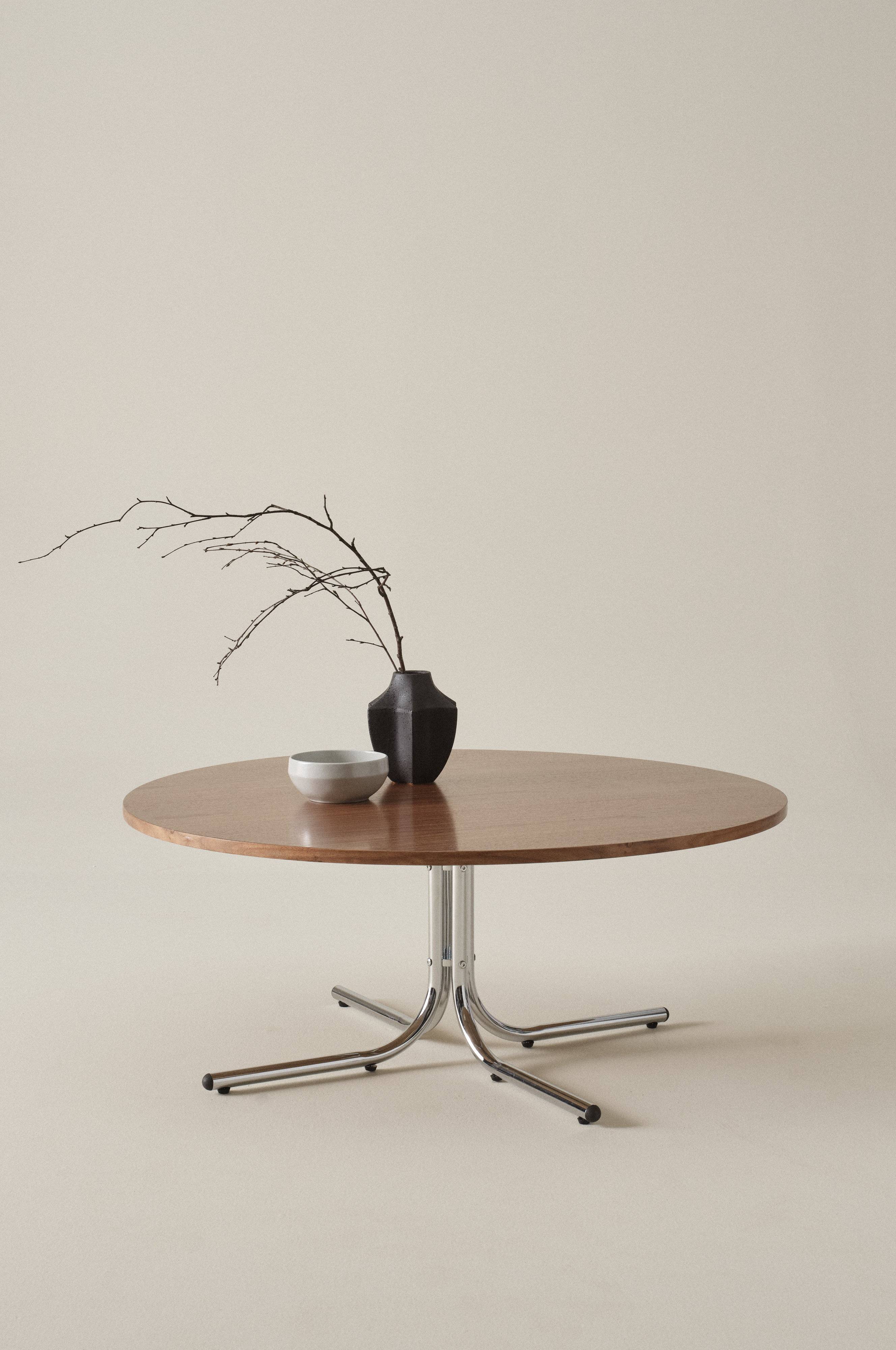 Pyöreä sohvapöytä, jonka jalusta on valmistettu kiiltävästä kromatusta rautaputkesta ja pöytälevy FSC-sertifioidusta MDF-levystä erilaisin pintavaihtoehdoin: pähkinäviilu, valkolakattu pinta tai vesipohjaisella maalilla mustaksi maalattu saarniviilu. Tyylikäs sohvapöytä huokuu viehättävää 1970-luvun retrohenkeä. Osittain koottava. Kokoamisohje mukana.