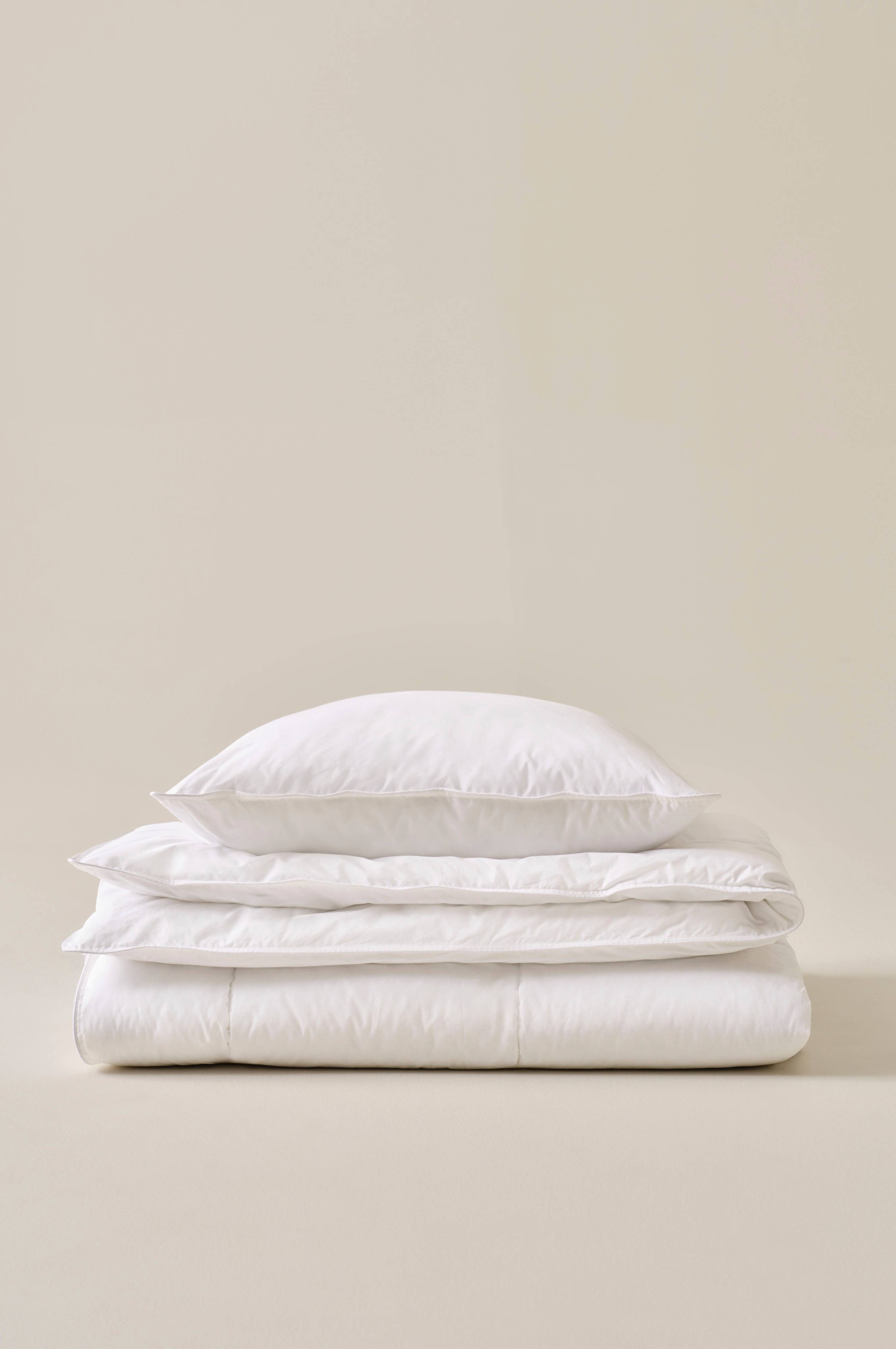 Vuodevaatepakkaus pehmeää ekologista puuvillaa. Tyyny, paino 950 g. Peitto medium, paino 1350 g. Kapeaan sänkyyn. Peitto on ruututikattu ja siinä on ommellut väliseinät, jotka pitävät täytteen paikoillaan. Täyte untuvajäljitelmää, joka antaa ihanan untuvan tunnun. Polyesteritäytteen ansiosta peitto on helppo pitää puhtaana ja raikkaana. Peitto ja tyyny on esikutistettu, joten ne eivät kutistu pesussa. Toimitetaan kätevässä kangaslaukussa.