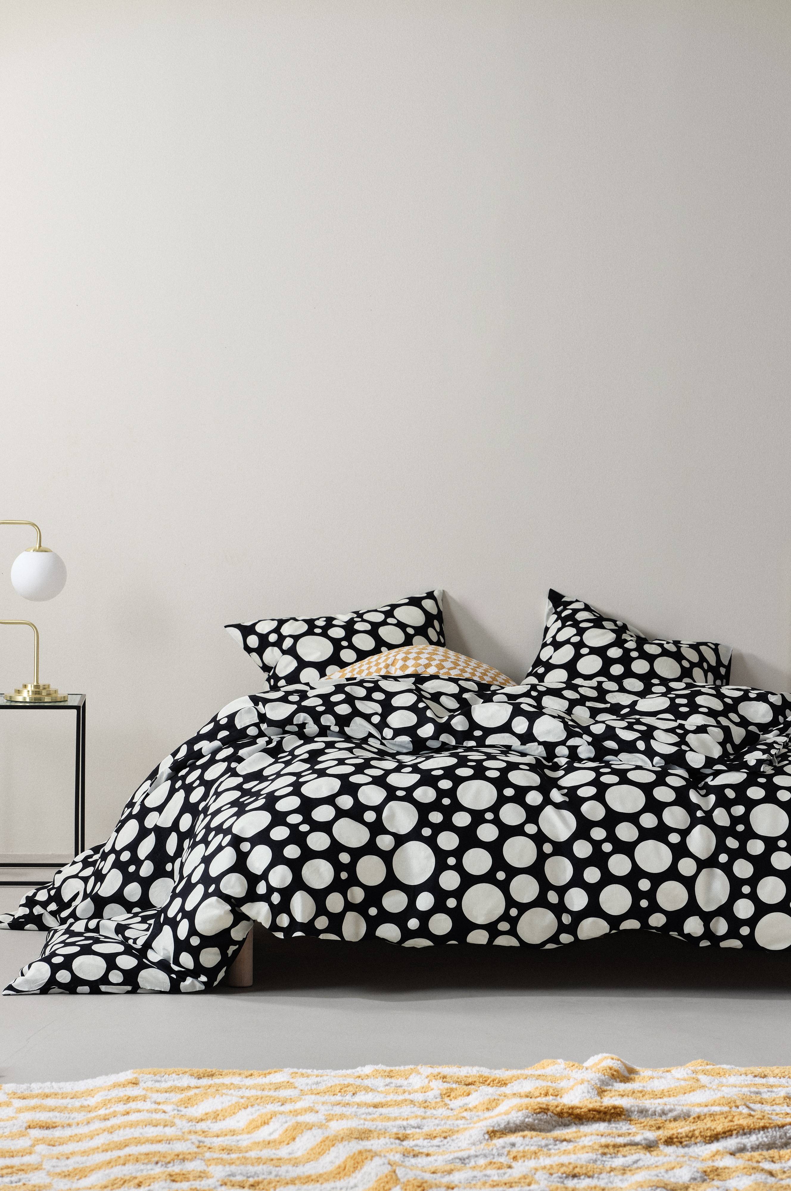 Kolmiosainen pussilakanasetti, jossa erikoisleveä pussilakana ja kaksi tyynyliinaa. Miellyttävää puuvillaa, jossa painettuja valkoisia pilkkuja. Puuvilla on viileä ja raikas materiaali, joka tuntuu miellyttävältä ihoa vasten. Pussilakanan yläkulmissa on aukot, jotka helpottavat pussilakanan vetämistä peiton päälle. Langantiheys 144 tc. (Langantiheys kertoo lankojen lukumäärän, thread counts, neliötuuman alalla. Mitä suurempi langantiheys, sitä laadukkaampi kangas.)