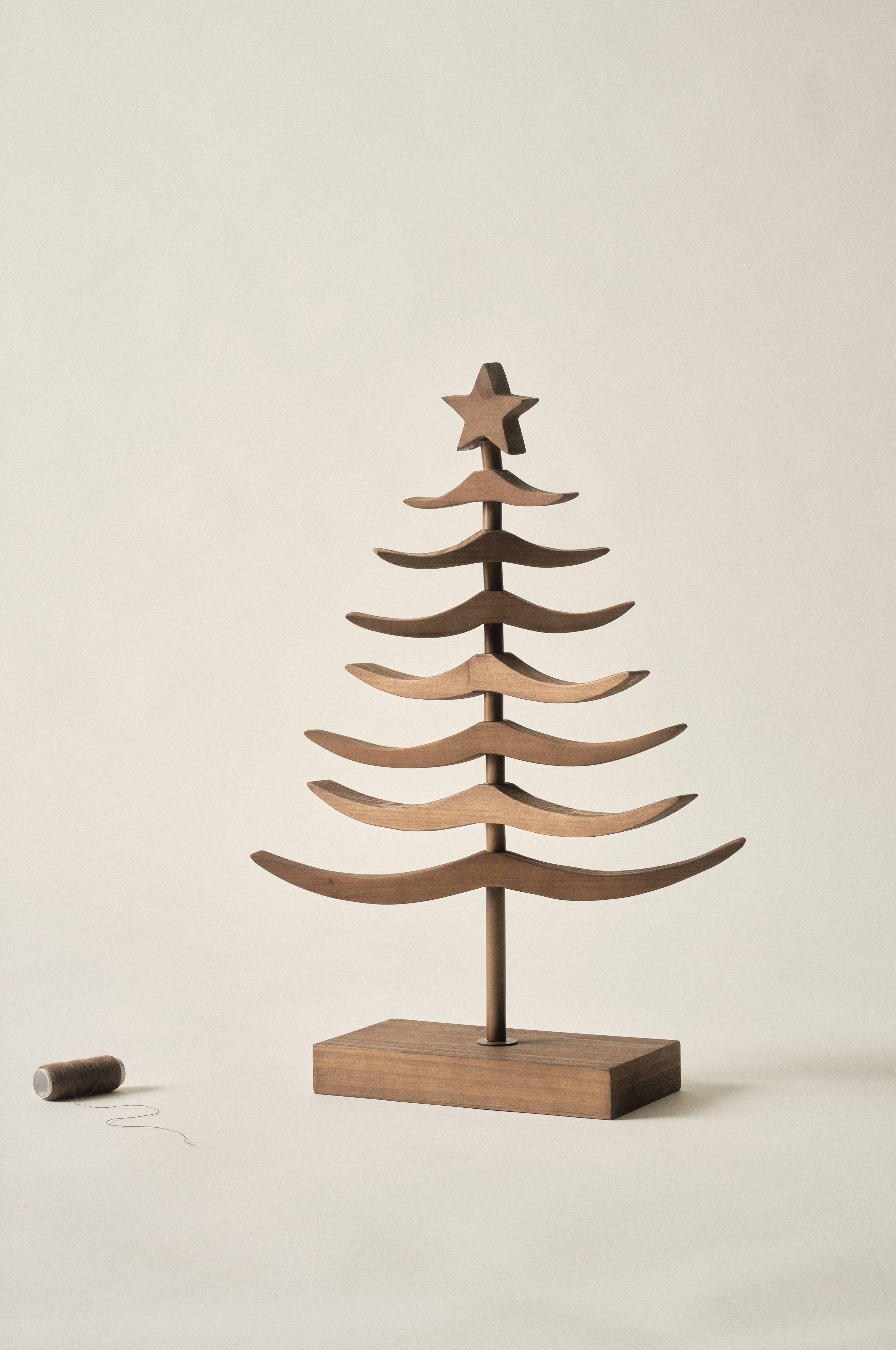 Kodikas puinen joulukuusi, jossa metallirunko. Kuusen latvassa on tähti ja oksat voidaan kääntää, joten voit itse päättää miltä kuusi näyttää - litteältä, pyöreältä vai kaikkea siltä väliltä. Kuusi seisoo puujalustalla.
