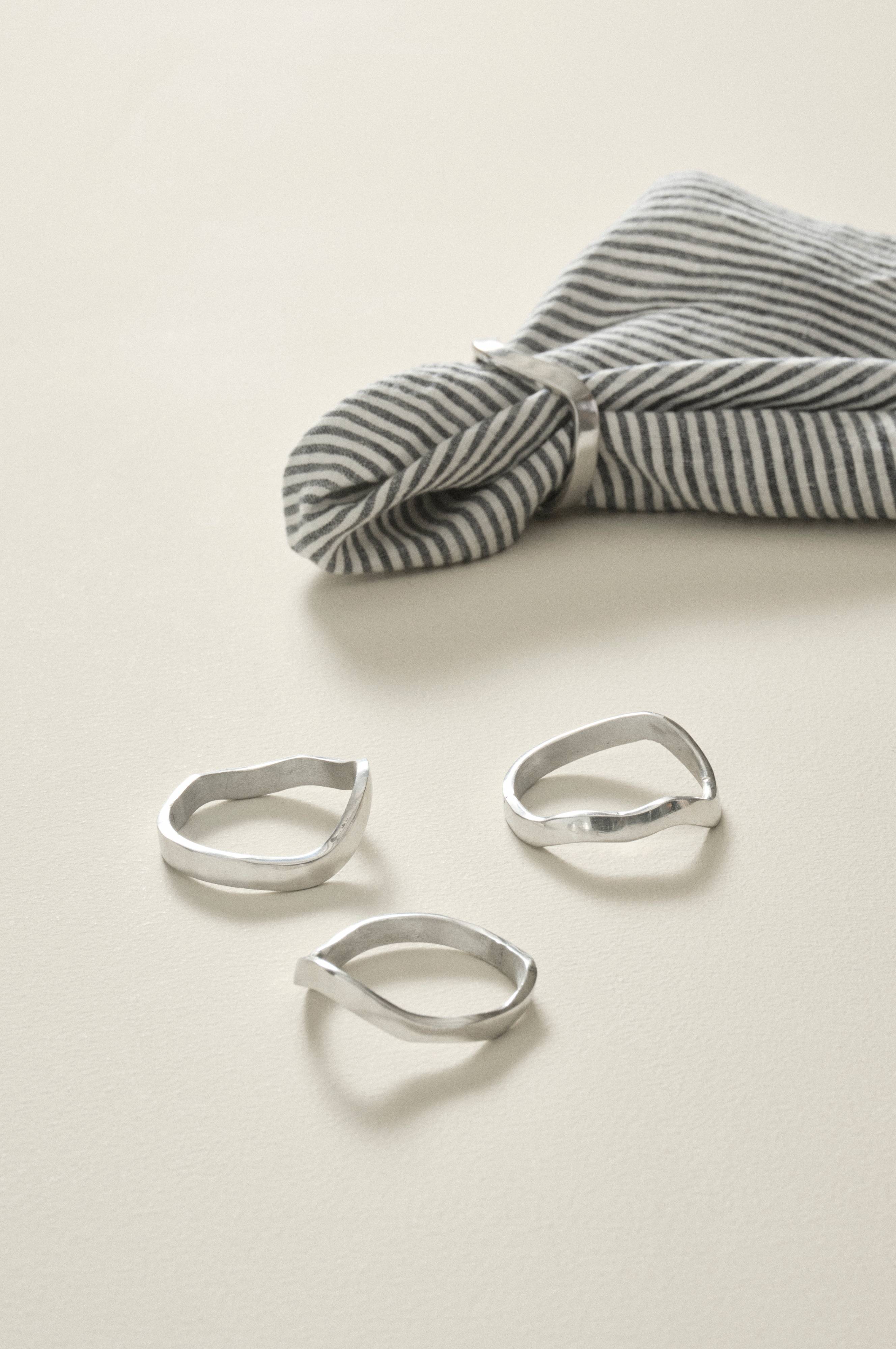 Lautasliinarenkaat alumiinia, jossa jauhemaalattu pinta. 4/pakkaus. Orgaaniset ja epäsäännöllisesti muotoillut renkaat luovat kangaslautasliinojen kanssa pehmeää tunnelmaa.