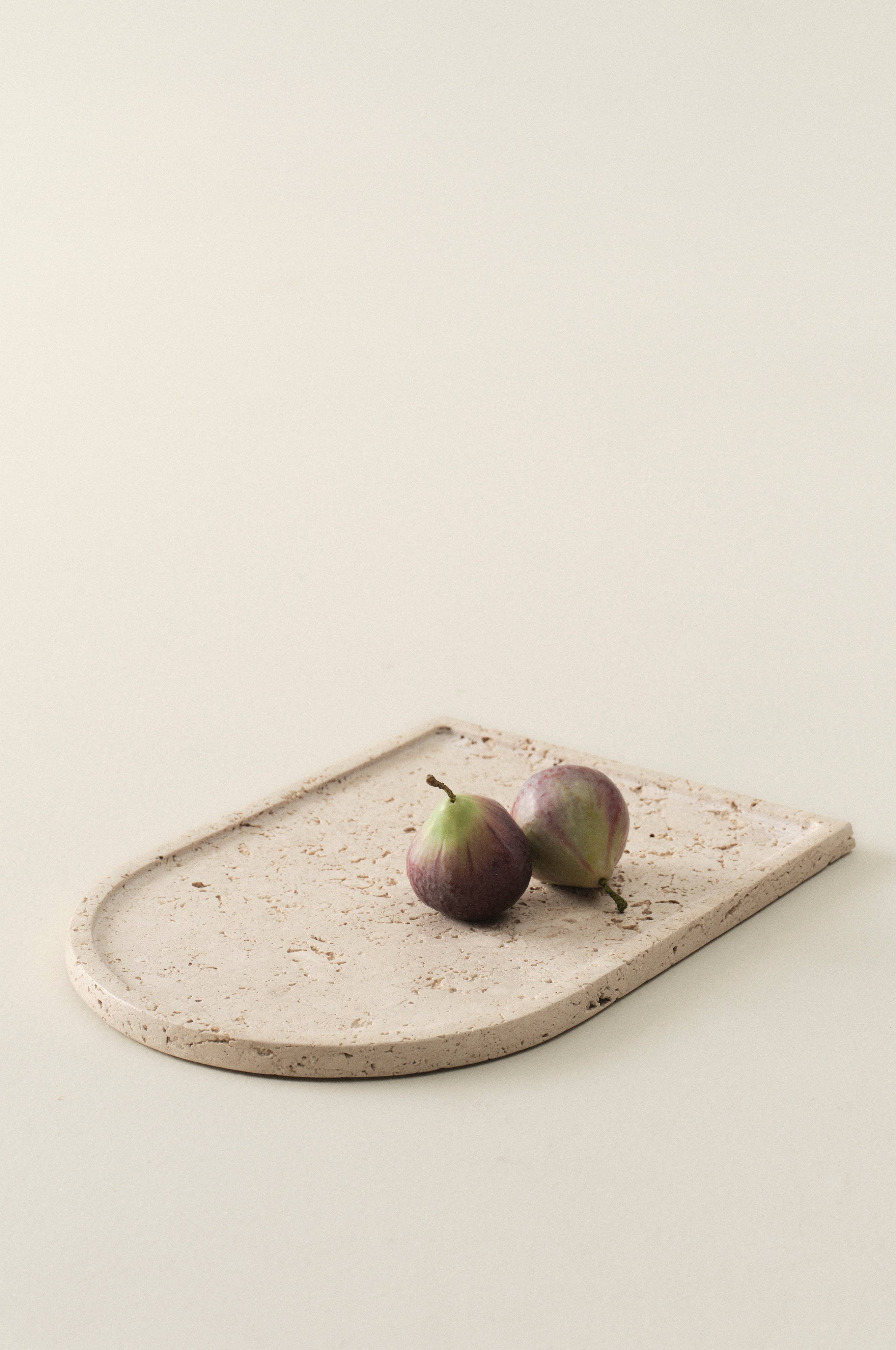 Tarjoilualusta luonnollista kalkkikiveä, jota kutsutaan travertiiniksi. Kauniisti muotoillussa tarjoilualustassa on pieni reuna ympäriinsä. Kivessä on kaunis marmoroitu väri ja pieniä koloja pinnassa. Travertiinissa on luonnostaan eroavaisuuksia, mikä tekee jokaisesta tuotteesta ainutlaatuisen.