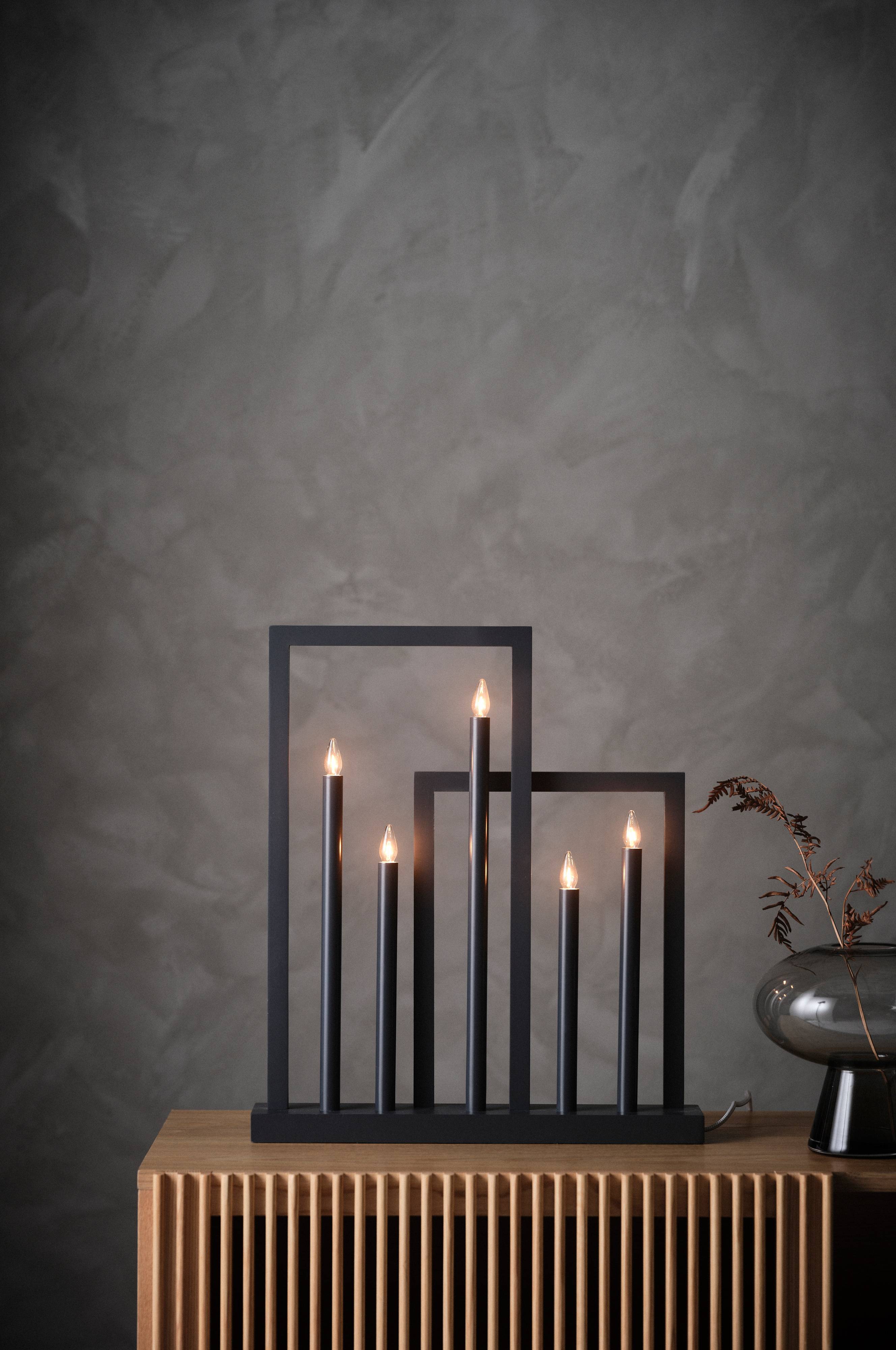 Grafiitinharmaaksi maalattu, puinen kynttilänjalka, jossa moderni design ja erikorkuiset metalliputket. Luo kotiin elegantin ilmeen. Valonlähteet mukana. Kangaspäällysteinen johto, johdon pituus 1,8 m.