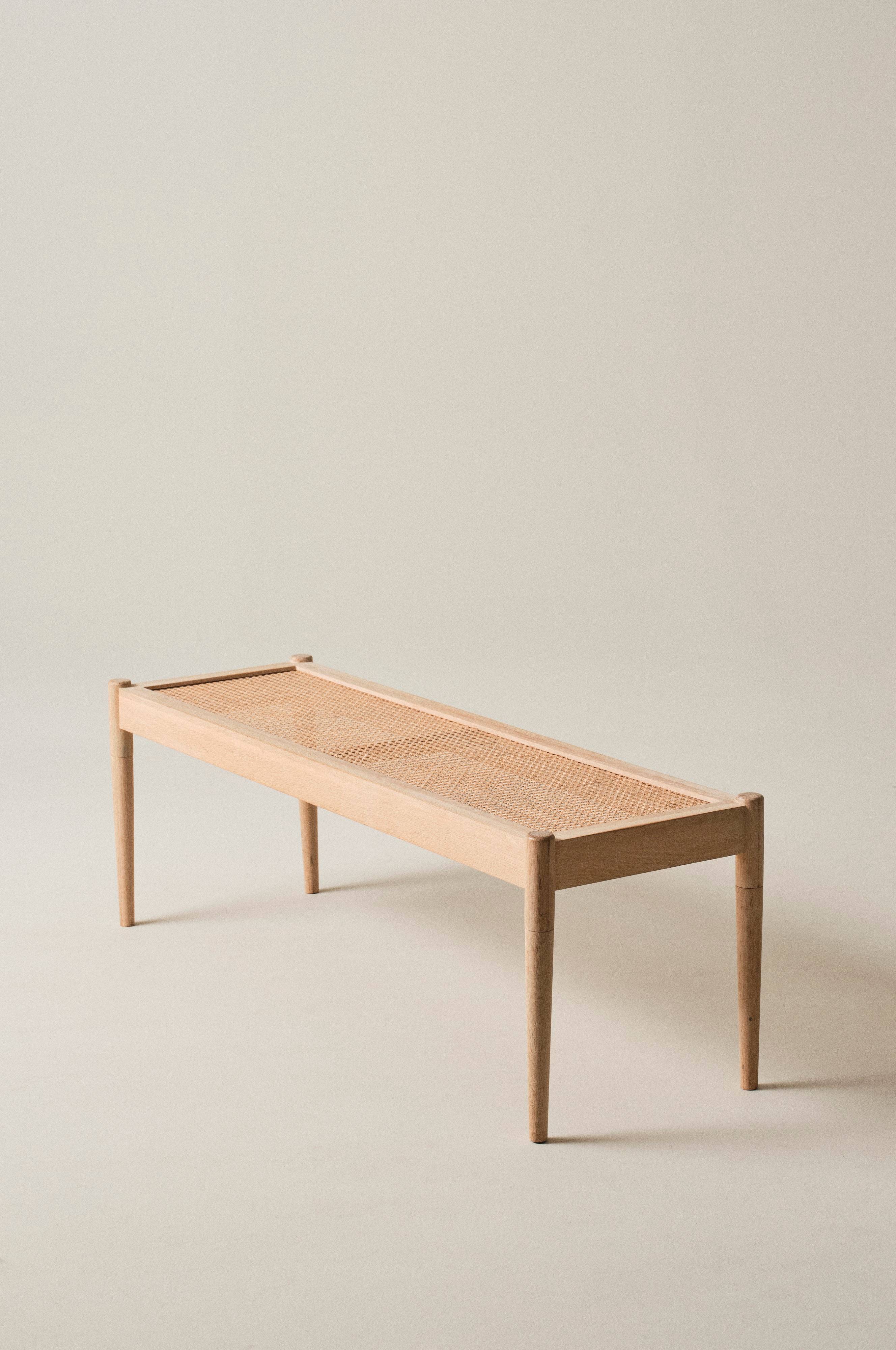 Penkki, jossa rottinkinen istuin. Vaaleaksi käsiteltyä tammea. Penkki sopii hyvin istumapaikaksi eteiseen tai laskutasoksi vaatteille makuuhuoneeseen. Penkki on kaunis sisustusyksityiskohta mihin huoneeseen tahansa.