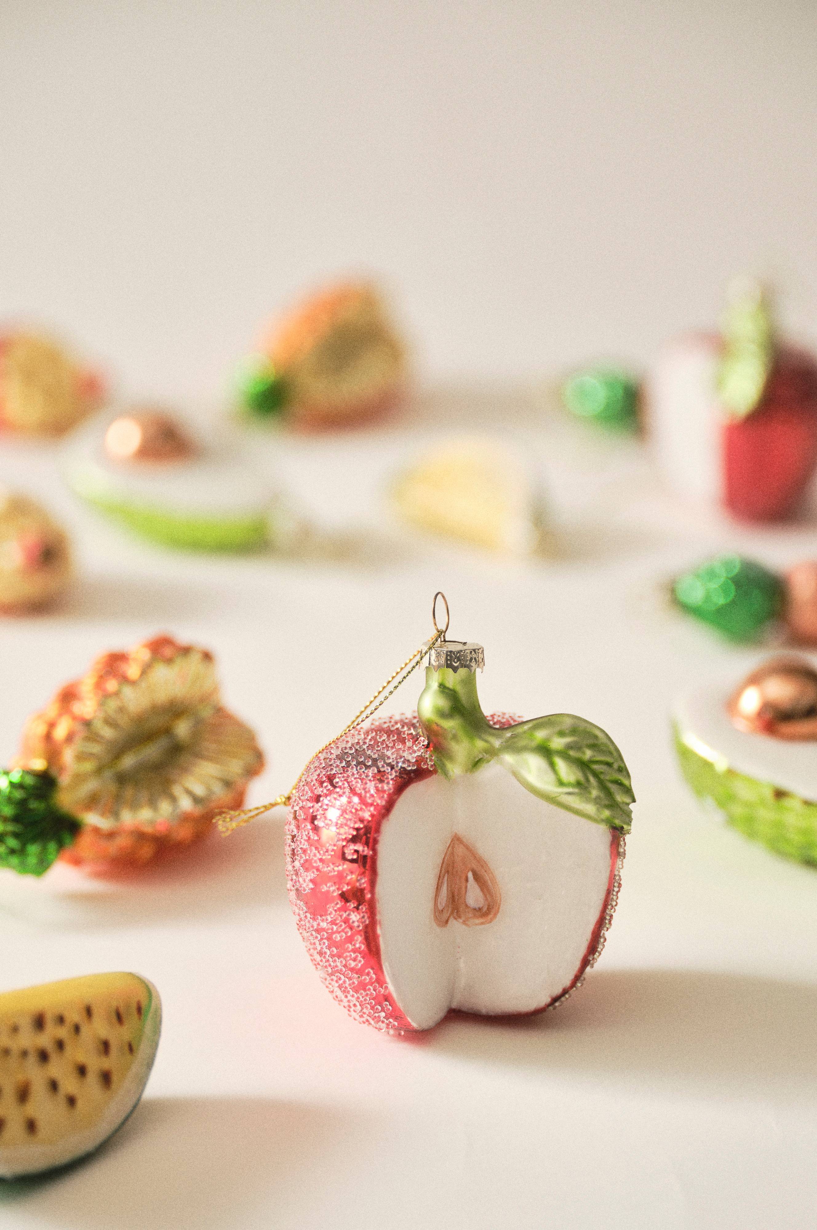 Hedelmäkoristeet yllättivät iloisesti. Ne olivat mielestäni hieman liian suuria hentoon joulukuuseemme, mutta toimivat sitäkin paremmin keittiön joulukoristeina hedelmävadille asetelt…