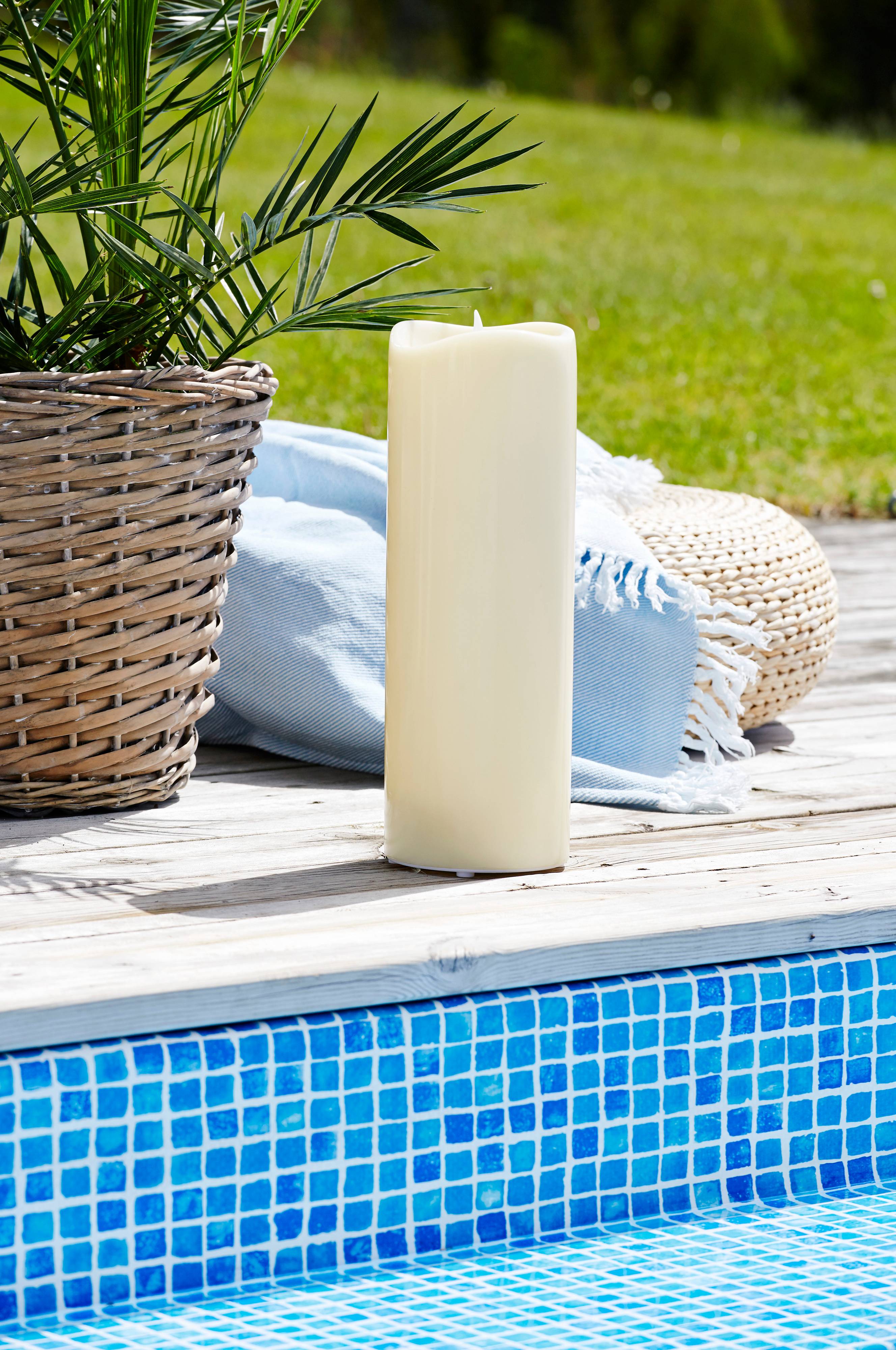 Muovikynttilä ulkokäyttöön. Kaunis lepattava liekki. Kynttilässä on sisäänrakennettu toistuva ajastin, joka on 6 tuntia päällä ja 18 tuntia pois päältä. Paina katkaisinta valitaksesi eri vaihtoehtoja: 1 päällä. 2 6 tunnin-ajastin. 3 pois päältä. Toimii kolmella C-paristolla. Paristot eivät sisälly pakkaukseen.