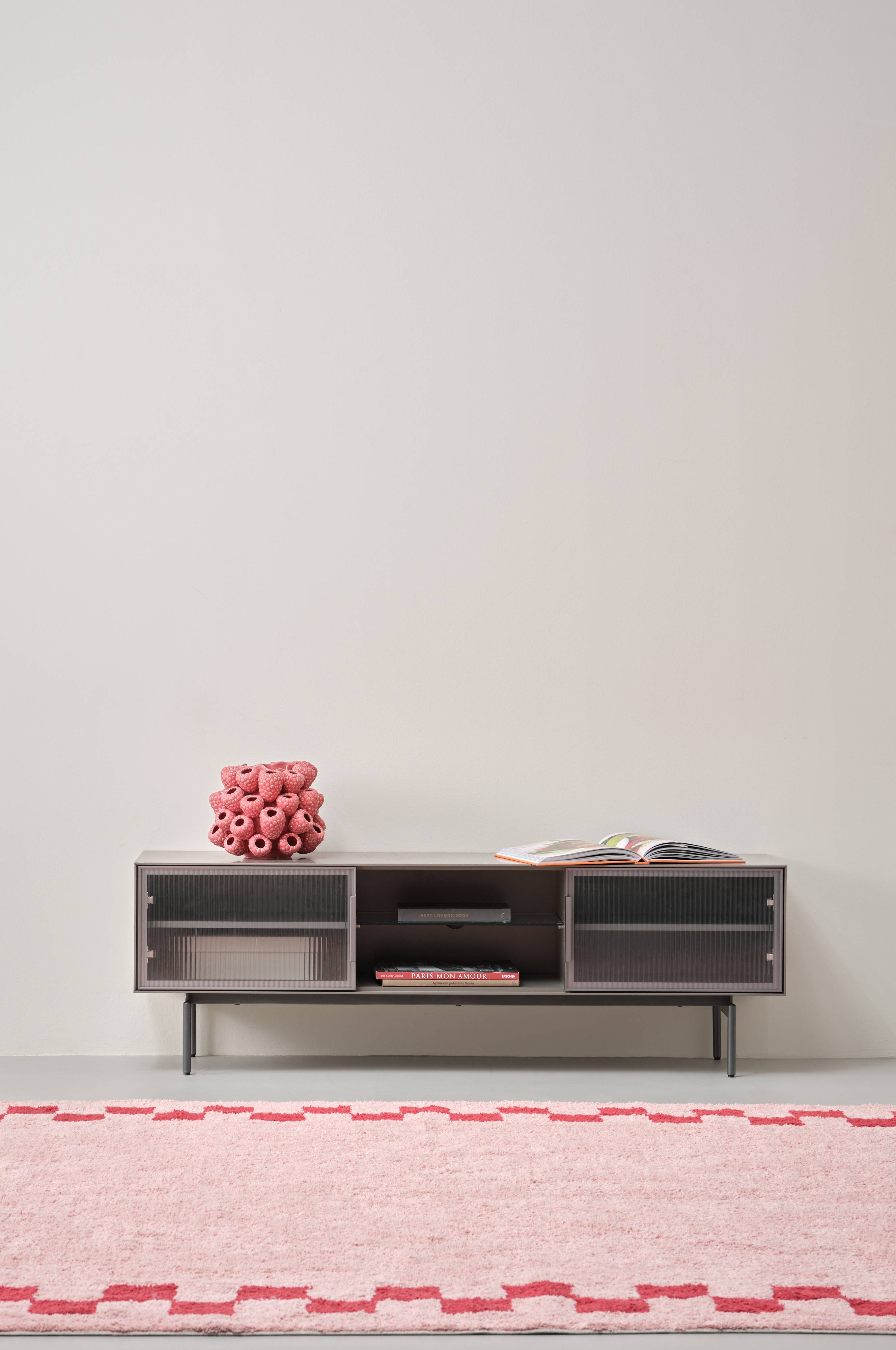 MDF-levystä valmistettu TV-penkki, jonka jalat on valmistettu raudasta. TV-penkki on jaettu kolmeen osaan. Kahdessa ovessa on karkaistua lasia, jossa on raidallinen kuvio. Keskimmäinen osio on avoin ja siinä on lasihylly. Jokaisessa osassa on säädettävä hylly. Kivat rautakahvat sopivat jalkoihin ja viimeistelevät ilmeen.