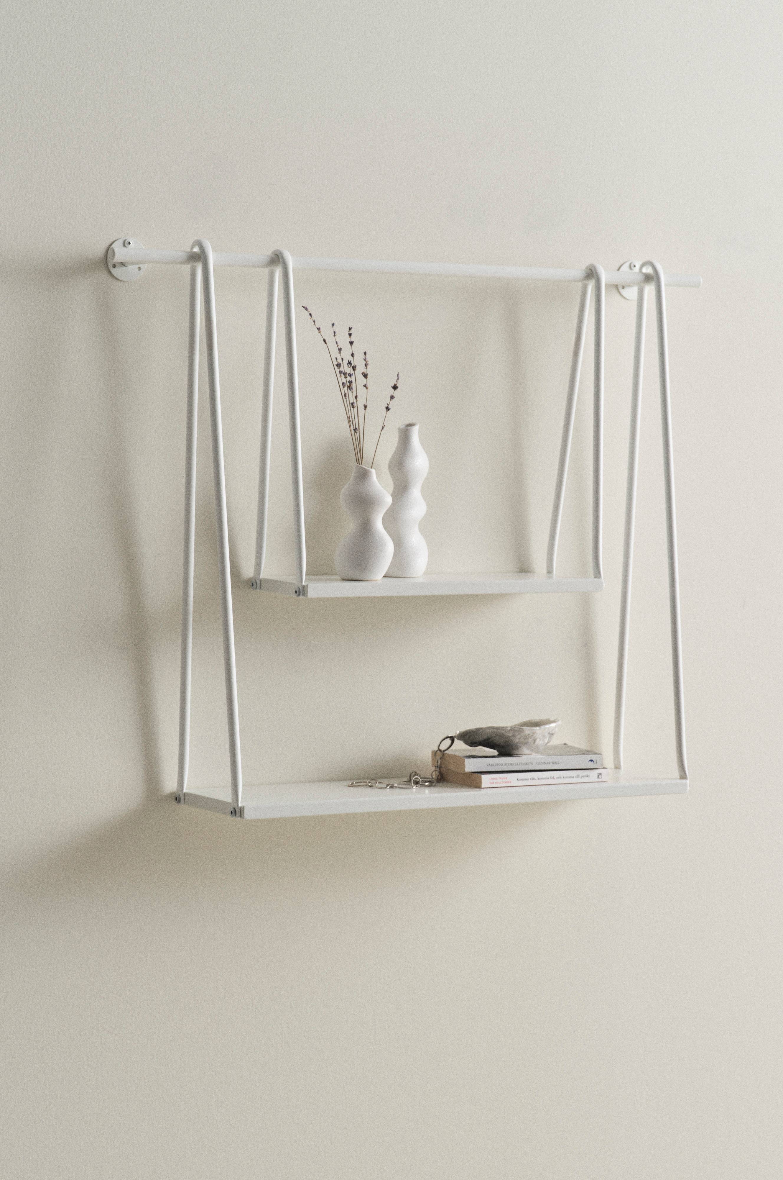Seinähylly rautaa, hyllyssä jännittävä design. Kaksi hyllyä roikkuu tangossa, joka kiinnitetään seinään. Pienempi hylly on kapeampi eikä niin syvä. Seinähylly on sekä kätevä ja kaunis, ja sopii täydellisesti esimerkiksi eteiseen. Hylly on maalattu öljypohjaisella maalilla.
