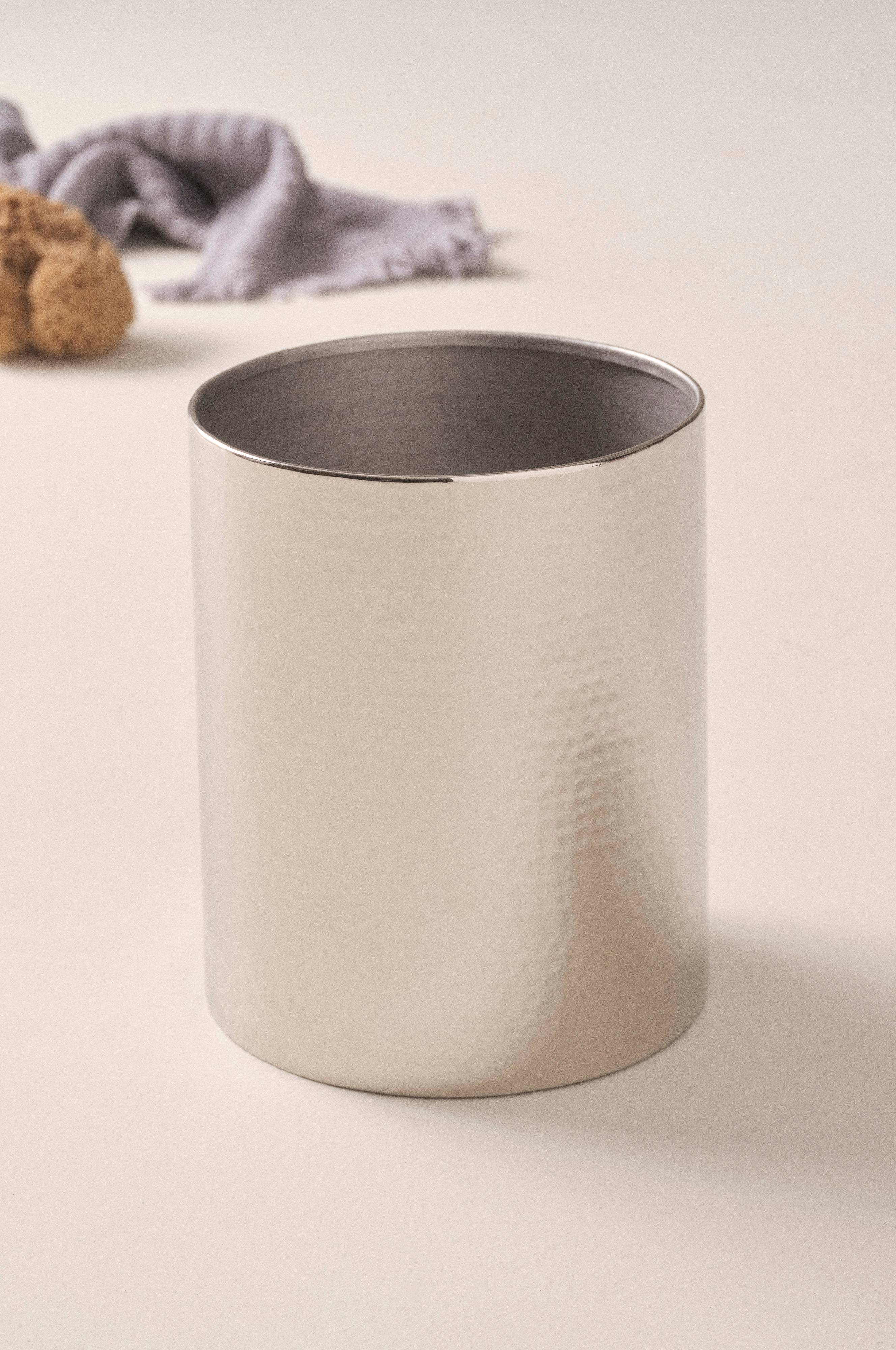 Roskakori ruostumatonta terästä, jossa epäsäännöllinen, taottu pinta. Roskakori sopii kooltaan täydellisesti pieniin tiloihin, kuten kylpyhuoneeseen ja WC:hen. HANNA-sarjassa on tyylikkäitä WC:n ja kylpyhuoneen tuotteita. Yhdistä useita saman sarjan tuotteita, niin saat tyylikkään ja yhtenäisen ilmeen kylpyhuoneeseen.