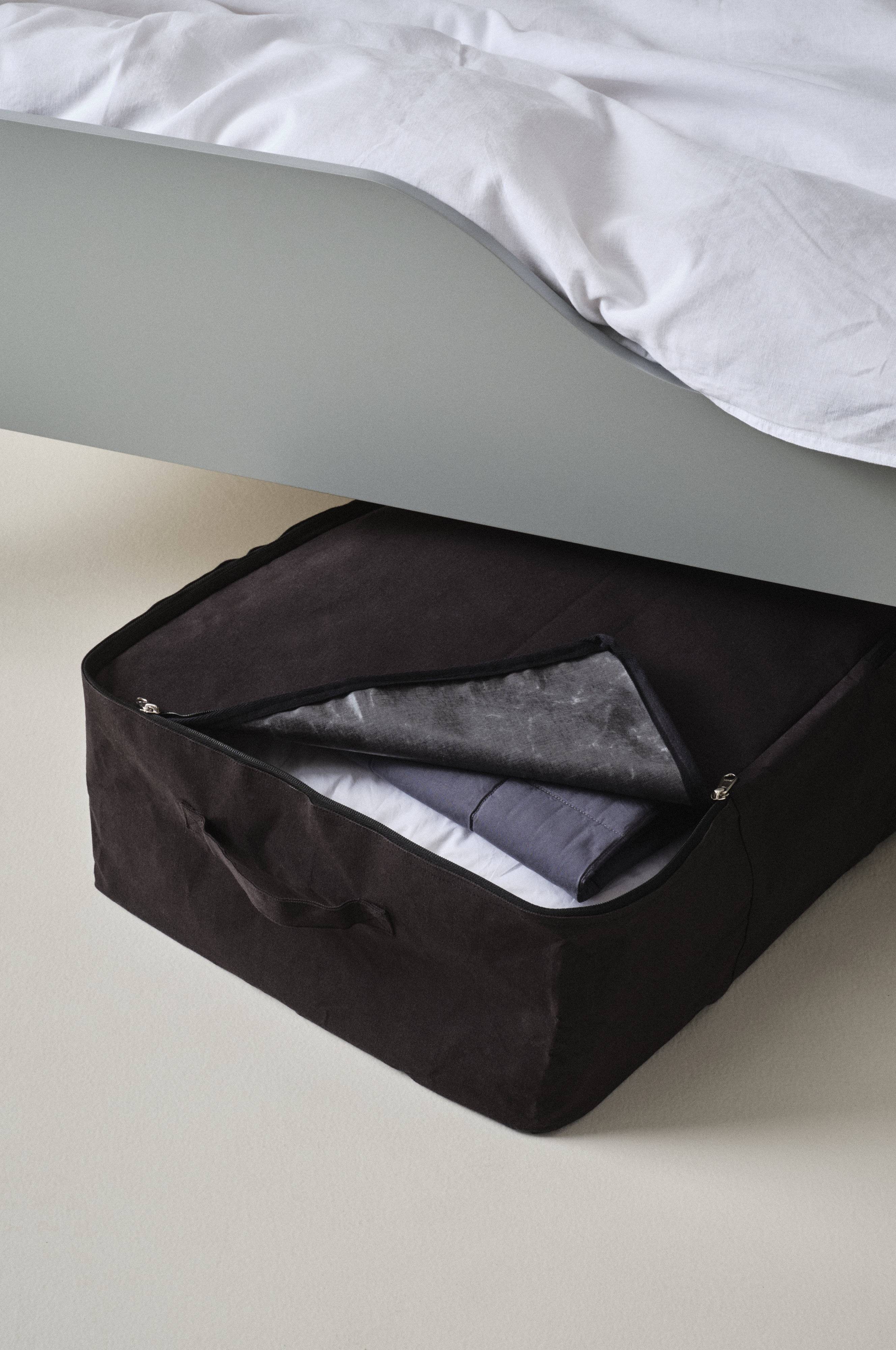 Puuvillainen sängynaluslaatikko, jossa suojaava polypropeenipinnoite. Nelikulmaisessa säilytyslaatikossa on ylhäällä vetoketju, joka helpottaa laatikon avaamista ja täyttämistä. Samalla saat myös hyvän yleiskuvan laatikon sisällöstä. Jos sinulla on vähän tilaa, voit säilyttää HIDING säilytyslaatikkoa tai -laatikoita sängyn alla. Laatikon korkeus on 20 cm.