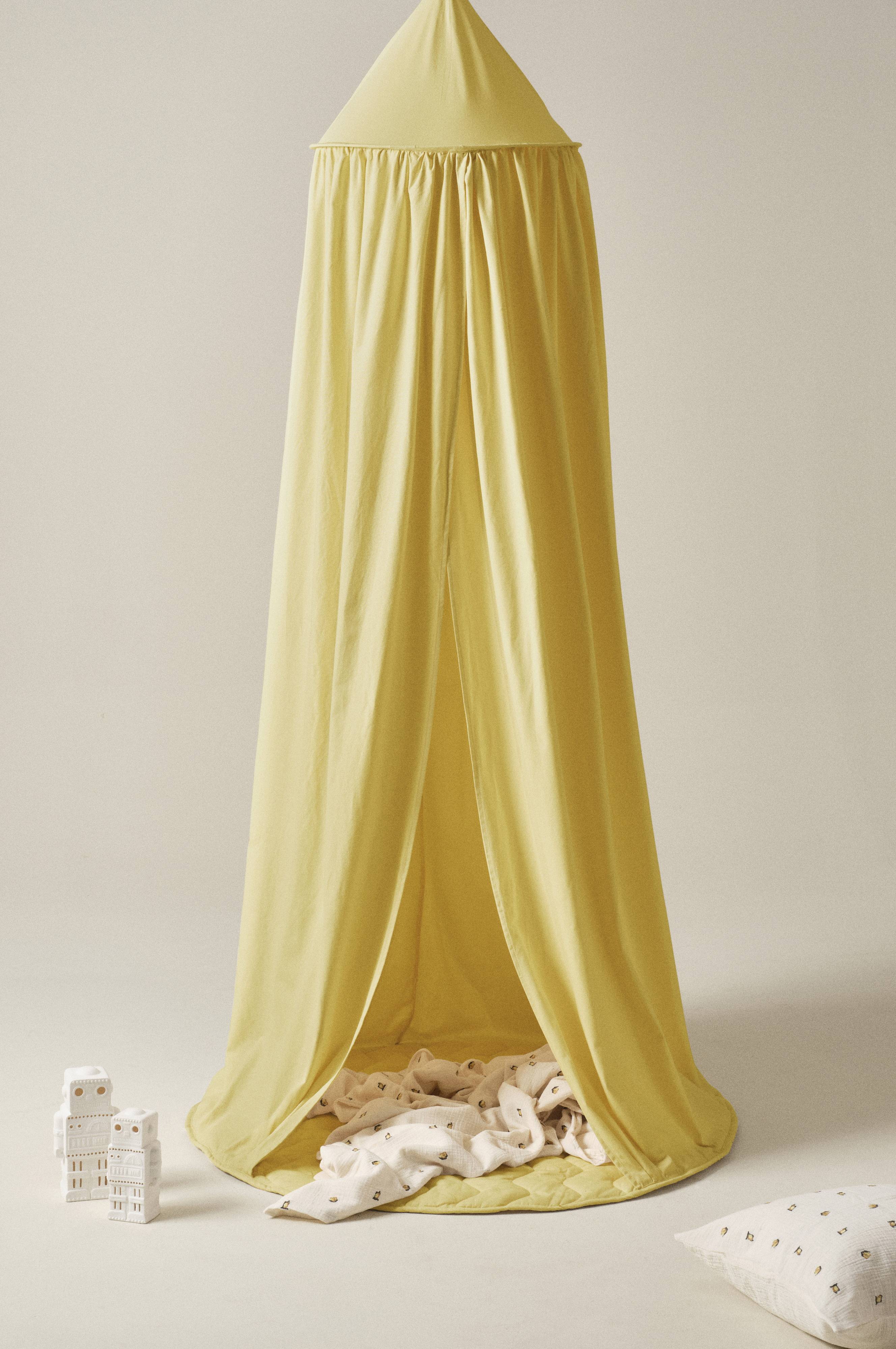 Pyöreä puuvillakankainen teltta, jossa pehmustettu, tikattu lattia. Lapsen on mukava istua pehmeällä lattialla. Teltta säilyttää muotonsa teltan kattoon ommellun metallirenkaan avulla. Ripusta teltta kattokoukkuun ja anna sen laskeutua lattialle, niin saat viihtyisän majan lastenhuoneeseen.
