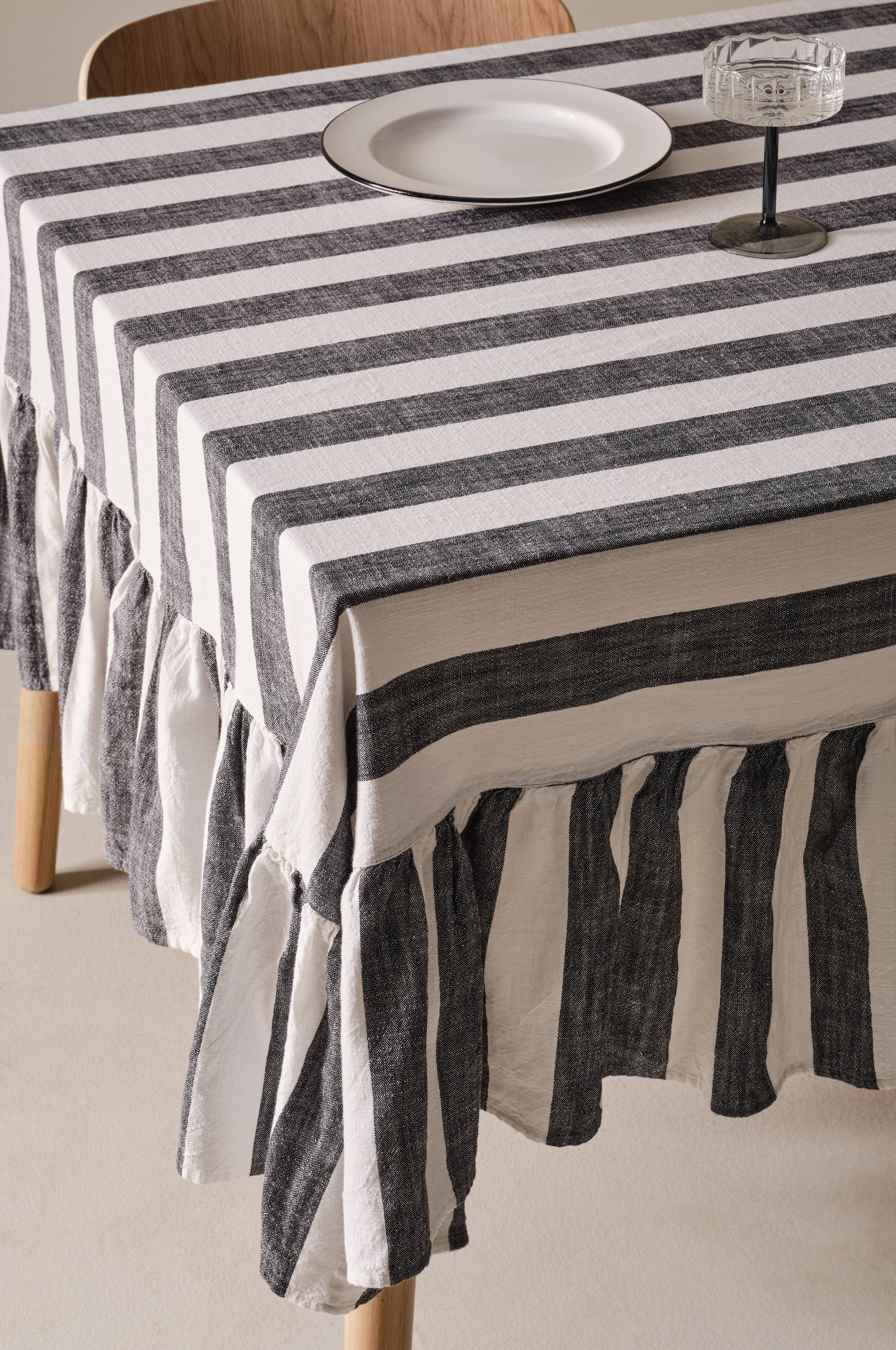 IRIS-pöytäliina tuo viehättävän vintage-tunnelman ruokailutilaasi. Puuvillakankaasta valmistettu kangas lupaa pehmeän kosketuksen korostaen sisustustasi. Erottuva lankavärjätty raidallinen kuvio ja siro röyhelö alareunassa luovat kutsuvan tunnelman, joka sopii mihin tahansa kokoontumiseen. Ihanteellinen niille, jotka arvostavat trendikästä sisustusta.