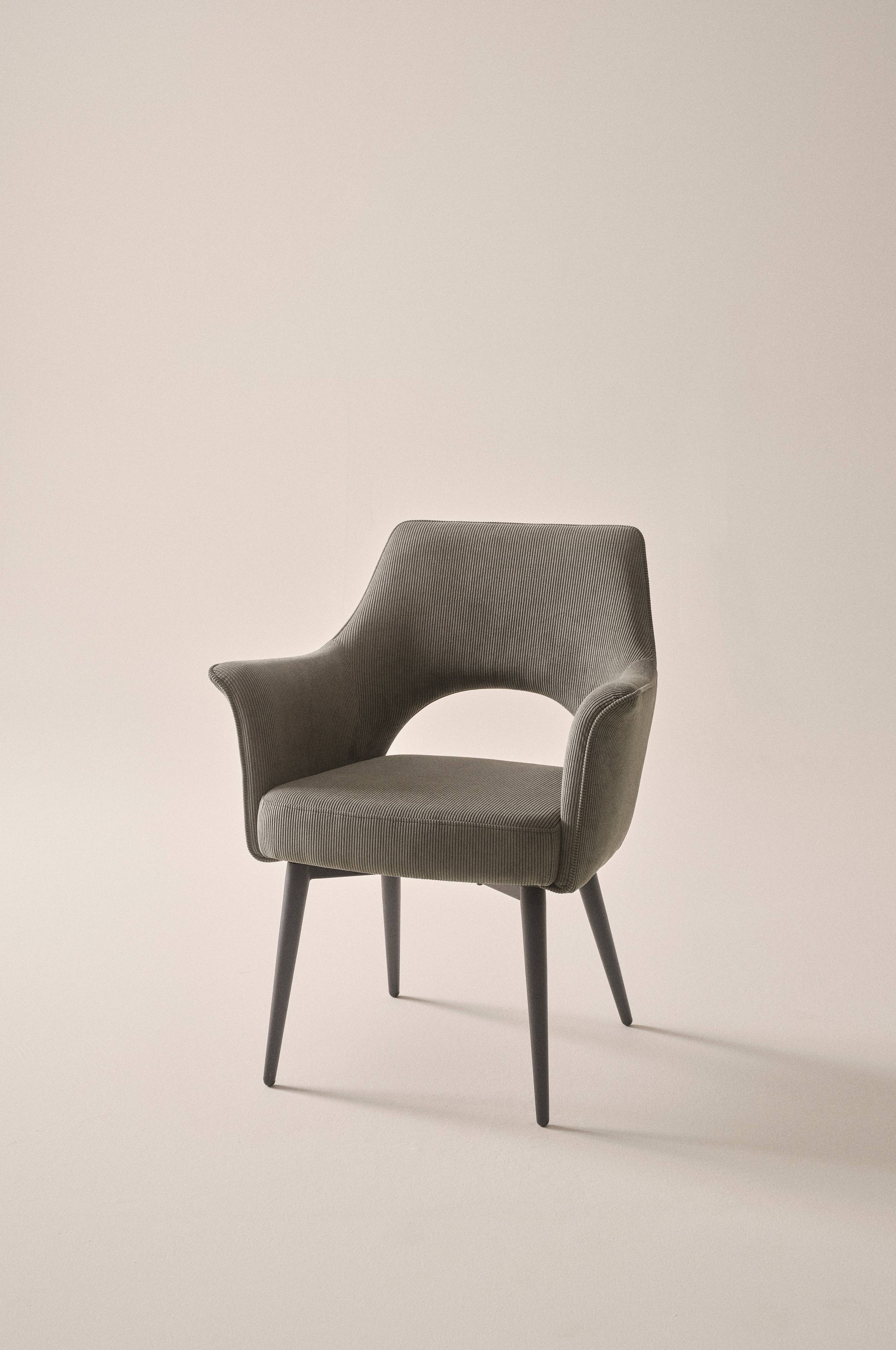 Käsinojallinen tuoli. Tyylikäs, pehmustettu malli, jossa vakosamettipäällinen. Jalat jauhemaalattua terästä. JESOLO on tyylikäs käsinojallinen tuoli, jossa on pehmeä vaahtomuovitäyte. Tuolissa on mukava istua. Erittäin kestävää vakosamettia, Martindale-arvo 40 000. JESOLOssa on mukava istua, ja se sopii hyvin ruokapöydän ympärille. Osittain koottava.