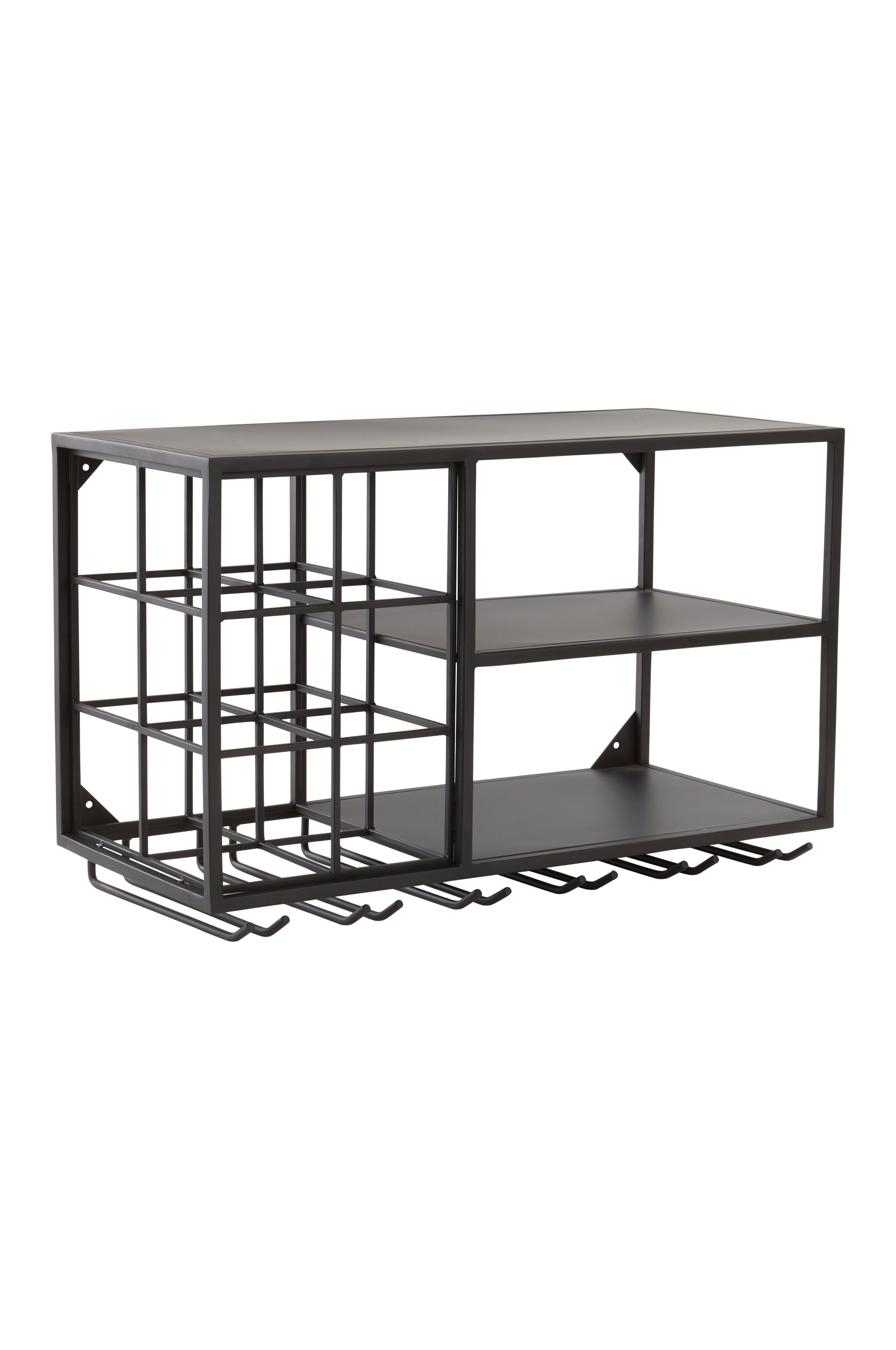 Raudasta valmistettu keittiöhyllykkö, jonka ruuvaat kiinni seinään ja saat hyvän säilytystilan. Hyllykössä on kaksi hyllyä, kuusi lokeroa viinipulloille ja kuusi uraa, joihin liu'utat lasien jalat niin, että lasit roikkuvat ylösalaisin. JESSIE-keittiöhyllykkö on tyylikäs, helposti saatavilla oleva ja avoin säilytystila, joka säästää tilaa keittiön kaapeissasi. Keittiöhyllykkö on mattamusta.