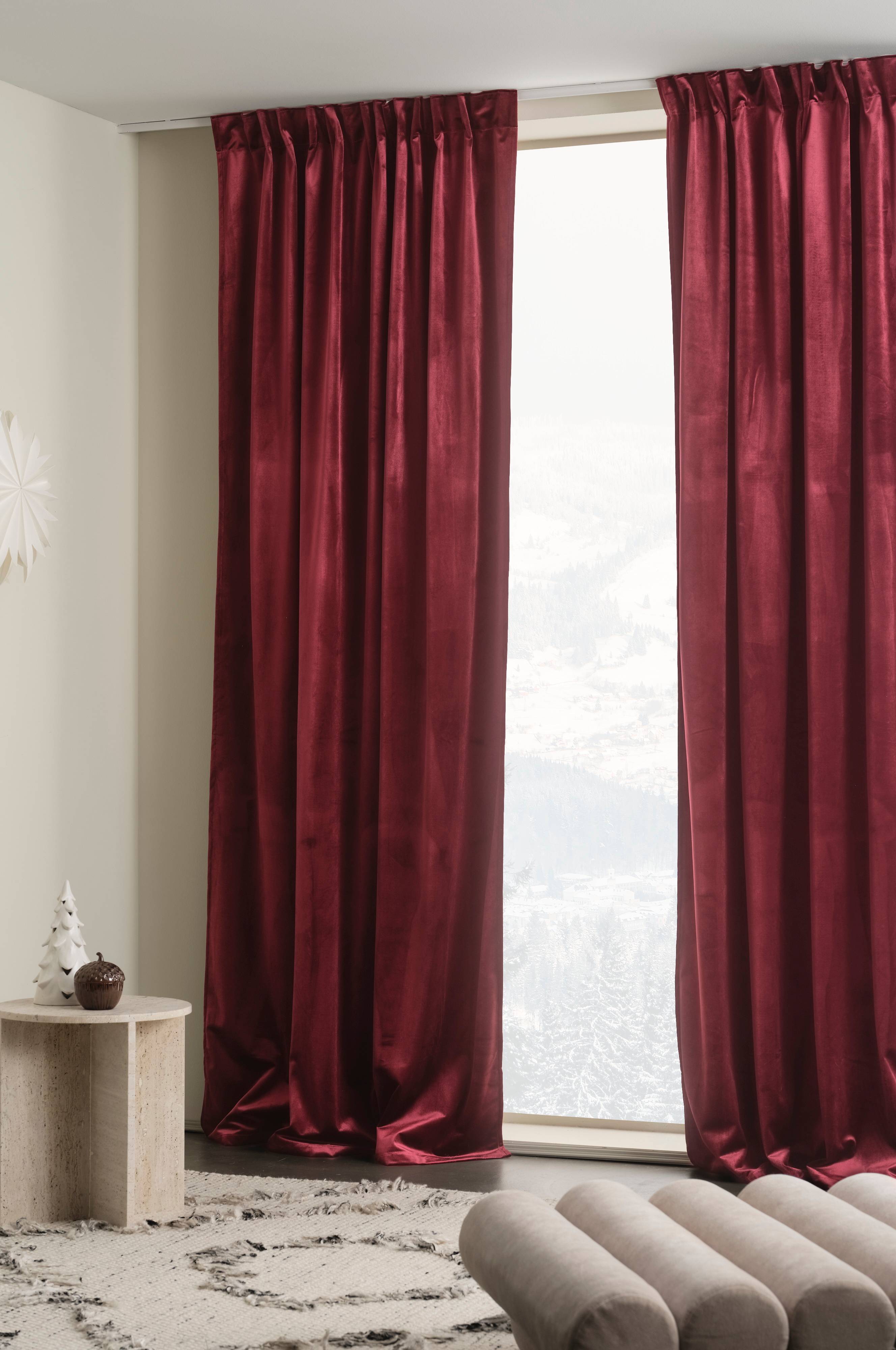 Sivuverhot hienostunutta polyesterisamettia. Kaksi verhoa/pakkaus. Samettikangas hohtaa kauniisti, ja sävy näyttää vaihtelevan sen mukaan, miten valo osuu siihen. Verhossa on päälleommeltu monitoiminauha. Verhot voidaan ripustaa sormikoukkujen, kujan tai piilolenkkien avulla.