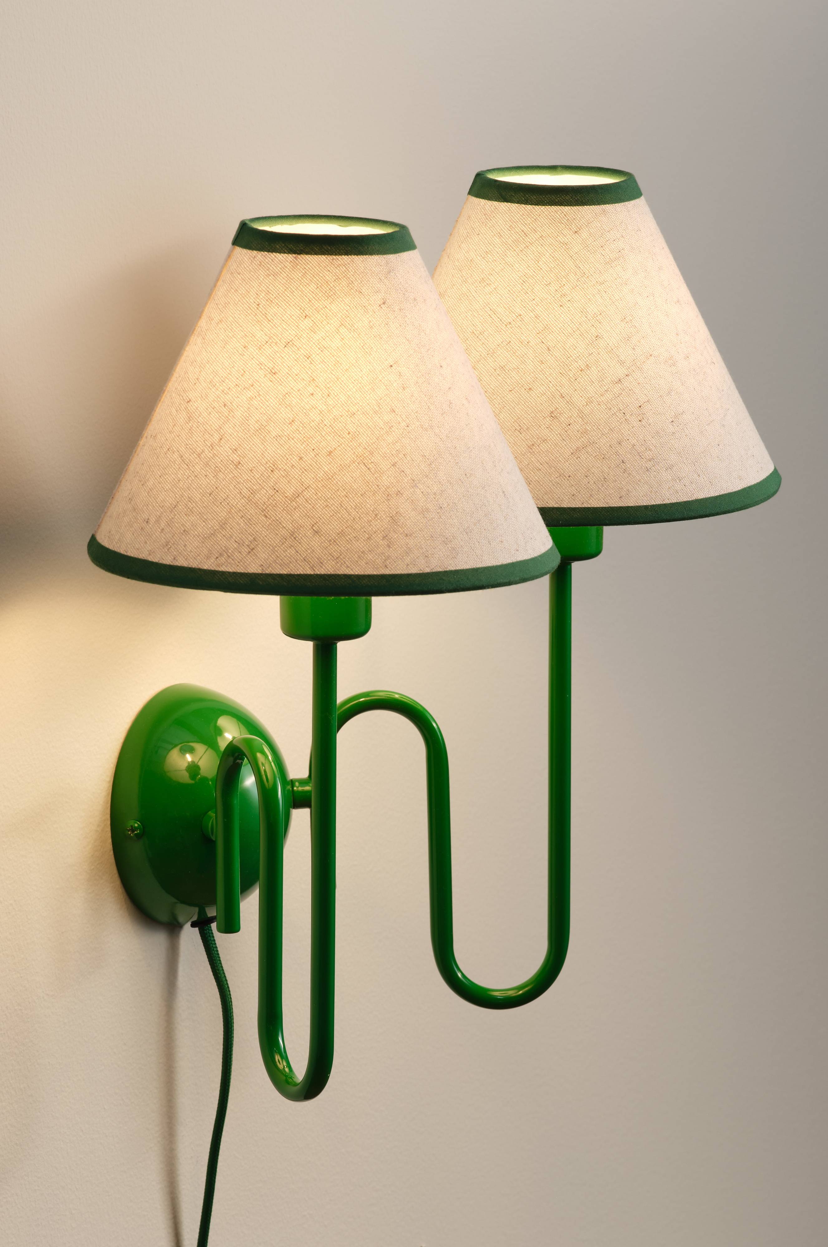 Juliet-seinävalaisimessa on kaksi kierrettyä vartta lakatusta metallista, tekstiilisävyjä luonnollisessa pellavassa ja kontrastivärinen reunus, joka on samanvärinen kuin varret. Seinälevystä kulkee tekstiilikaapeli, joka on samanvärinen kuin lakattu pinta. Tämä on lamppu, joka herättää huomiota ja luo mukavan lämpimän ympäristön, johon laitat sen. Yhtä mukava keittiön tiskin yläpuolella kuin käytävällä tai katseenvangitsijana olohuoneessa.