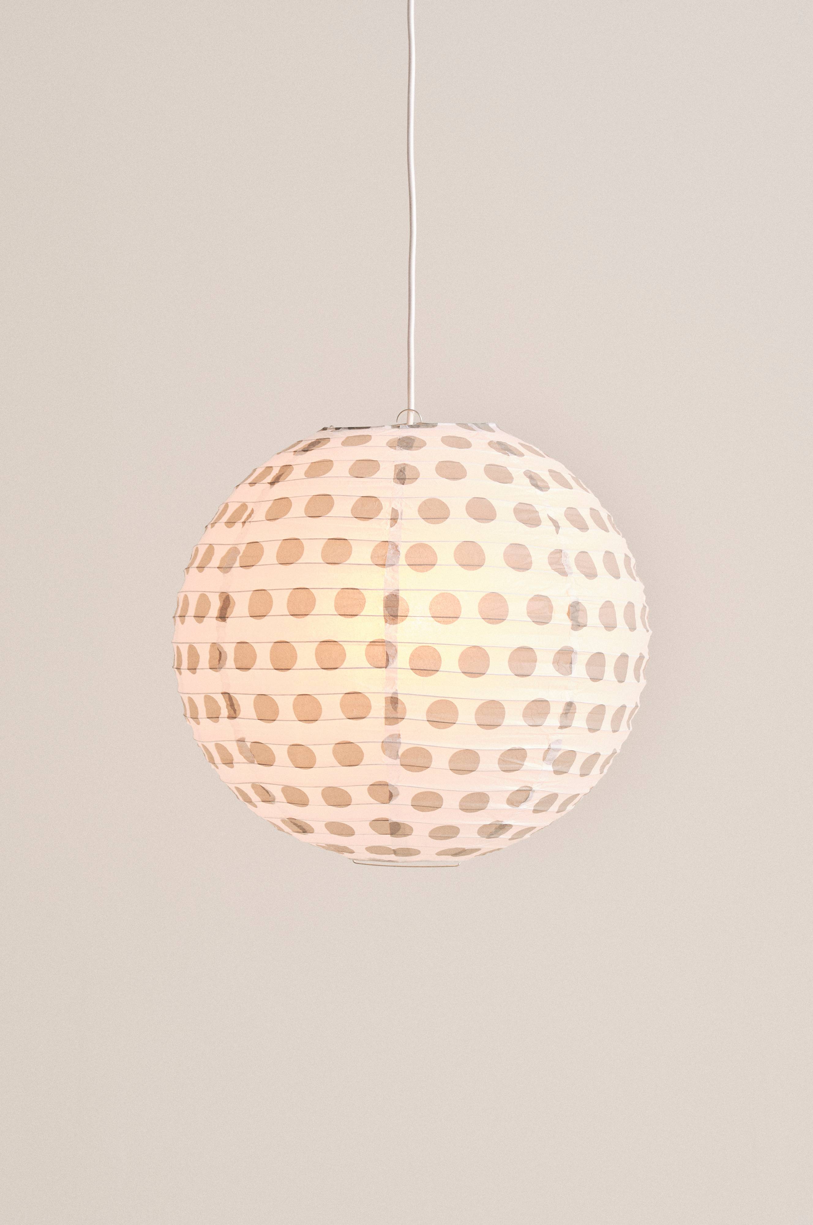 Kattovalaisin, jossa pilkullinen riisipaperivarjostin. Varjostin siivilöi kauniisti valoa. Valkoinen johto, johdon pituus 1,2 m. Maadoittamaton, luokka 1. EU-sääntöjen vuoksi tietyissä maissa vaaditaan erillinen kattopistoke. Kattopistokkeen tulee olla maadoitettu (luokka 1), ja se ostetaan erikseen.