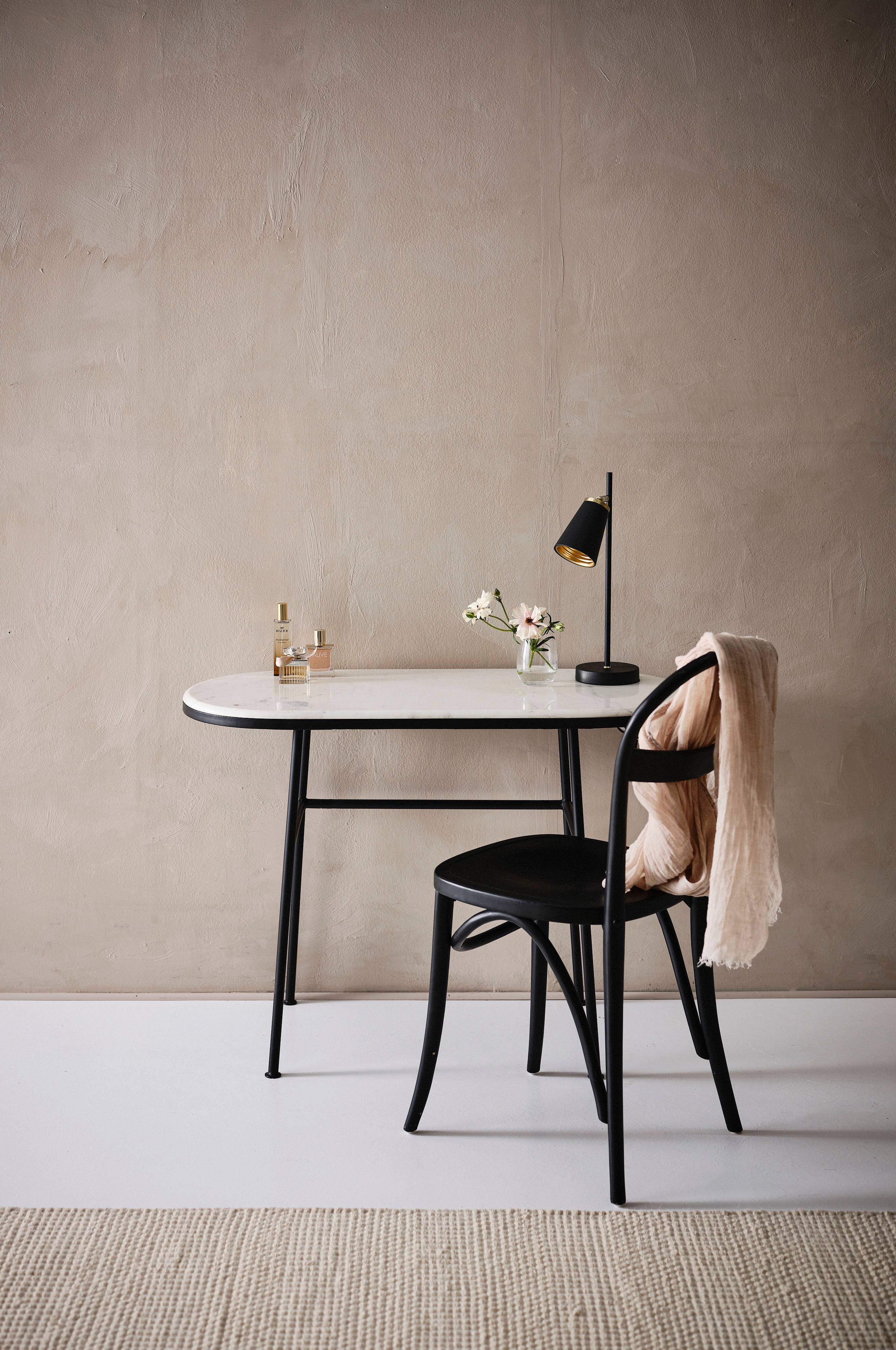 Kirjoituspöytä jauhemaalattua metallia, pöytälevy marmoria. Pöytälevyn pyöristetyt kulmat antavat pehmeän vaikutelman. Osittain koottava. Kokoamisohje mukana.