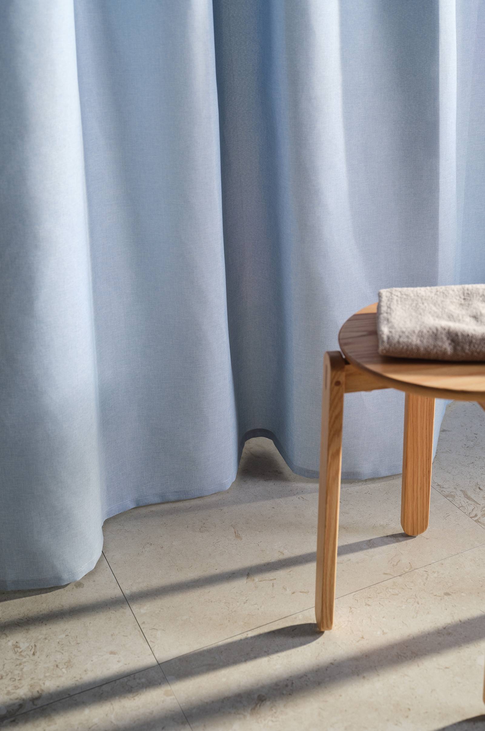 Pellavamainen suihkuverho, jossa kaksitoista rengasta ylhäällä. Polyesteristä valmistetusta suihkuverhosta on saatavana kolme harmonista perusväriä, jotka sopivat hyvin pellavamaiseen materiaaliin. Kankaassa on vettä hylkivä pinnoite.