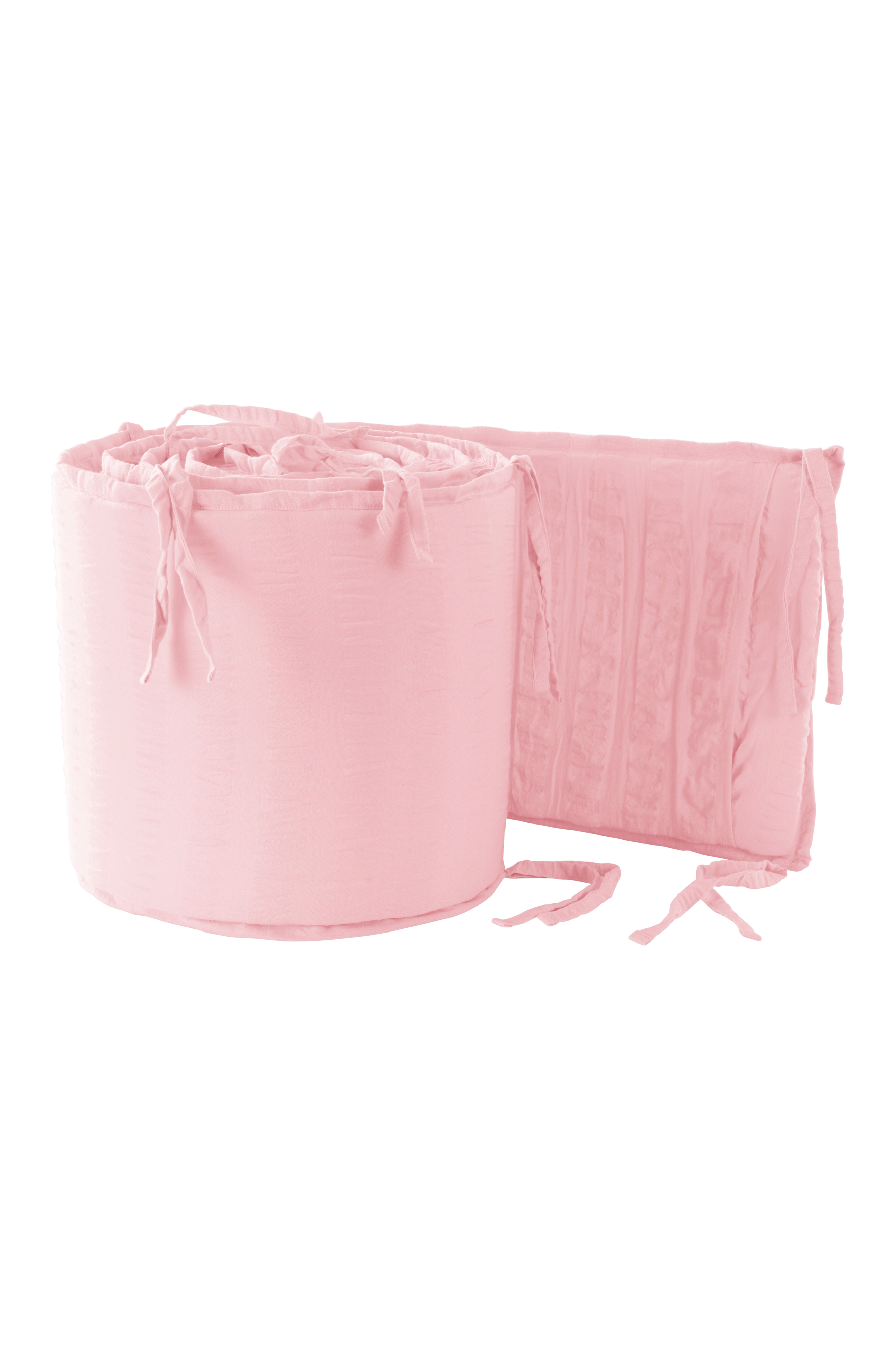 Pinnasängyn reunapehmuste, jossa päällyskangas miellyttävää kreppikangasta sertifioidusta ekologisesta puuvillasta. Kreppi on ilmava materiaali, ja kuplamainen kangas tuntuu viileältä ja on miellyttävän hengittävää. LOLO-sarja on yksivärinen ja samalla raidallinen. Tyynyliinassa on vuorotellen sileää kangasta ja kreppikangasraitoja. Kangas on lankavärjätty ja pesty miellyttävän tuntuiseksi. Täyte polyuretaania, jossa pehmeä vaahtomuoviydin. Reunapehmuste tekee pinnasängystä kodikkaan ja kutsuvan sekä estää lasta lyömästä itseään pinnoihin nukkuessaan. Pinnasängyn reunapehmuste kiinnitetään sänkyyn solmimisnauhoilla. Päällyskangas on irrotettava ja pestävä. Kankaan paino 225 g/m².