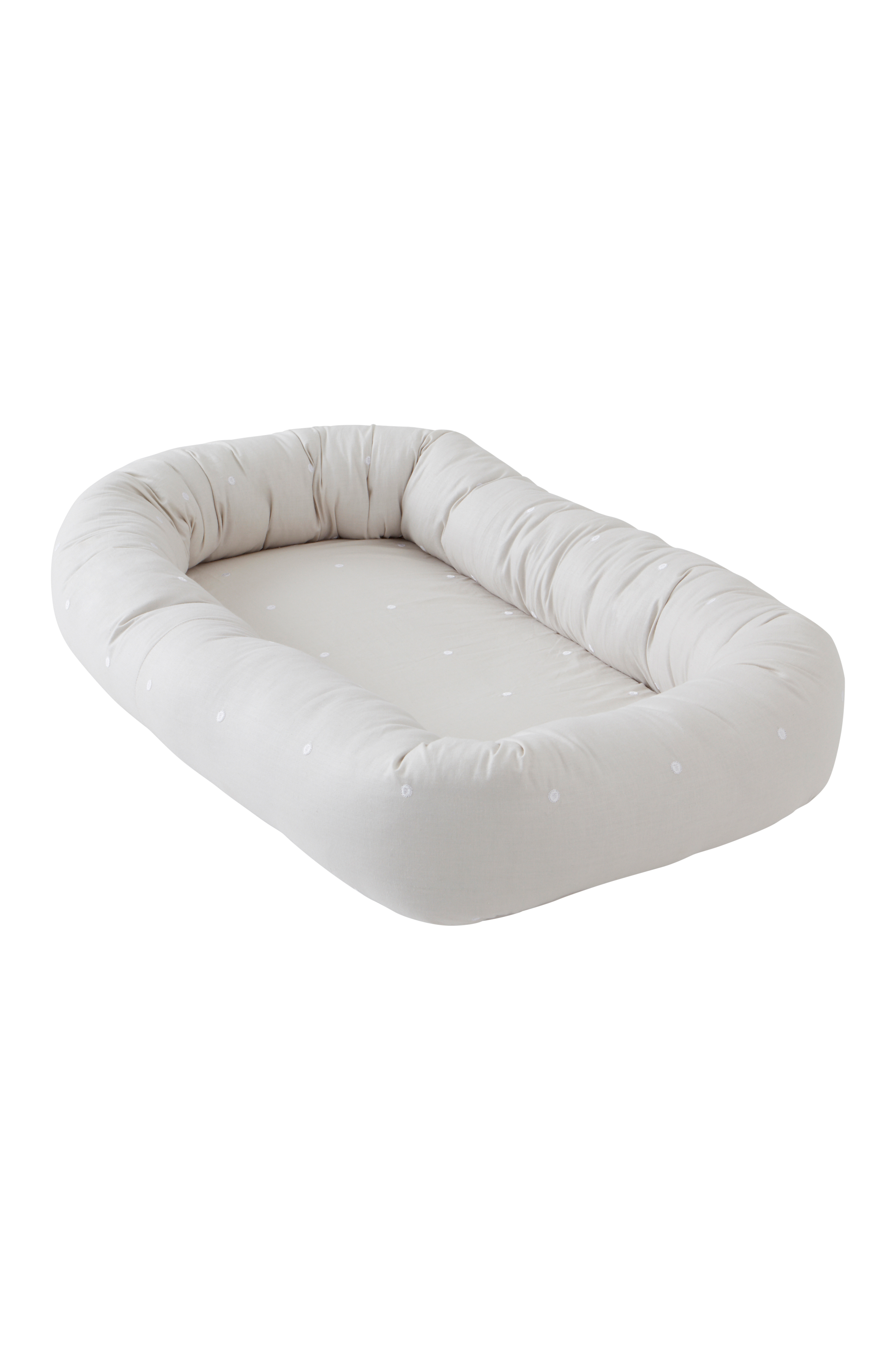 Vauvan unipesä pehmeää ekologista puuvillaa, jossa kirjailtuja pilkkuja. Pehmeäksi topattu reuna, jossa polyesteritäyte. Irrotettava patja on polyuretaanista valmistettua vaahtomuovia. Vauvan unipesä on miellyttävä ja turvallinen nukkumispaikka vauvallesi. Sopii täydellisesti pinnasänkyyn, viereesi sohvalle tai hoitoalustaksi matkalle.