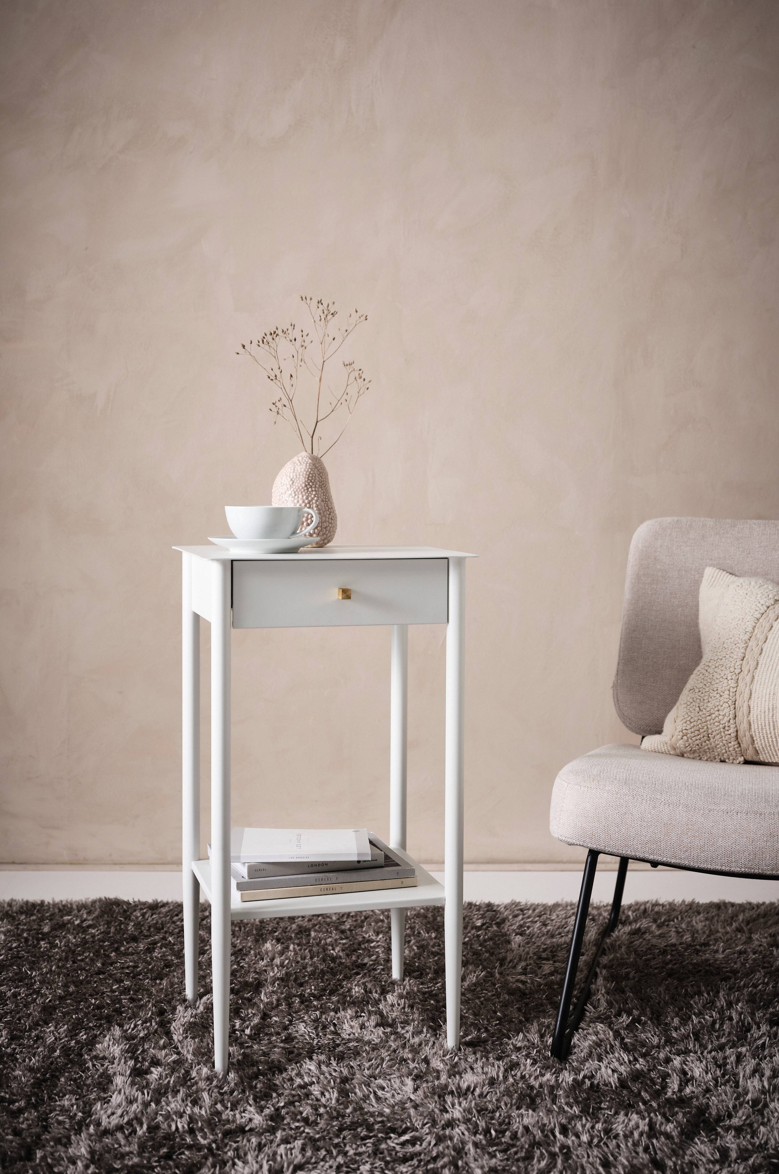 Sivupöytä jauhemaalattua terästä. Yksi laatikko ja hylly. Laatikon vedin on vaihdettava, joten voit helposti muunnella sivupöydän ilmettä. Mukana kolme vedintä - yhteensopivan värinen kulmikas metallinuppi, pyöreä messinkinuppi ja kulmikas messinkinuppi. LYNTON on ylellinen ja tyylikkään muotoinen pöytä, joka sopii hyvin sohvan viereen. Se on myös kaunis sisustuselementti kotiisi.
