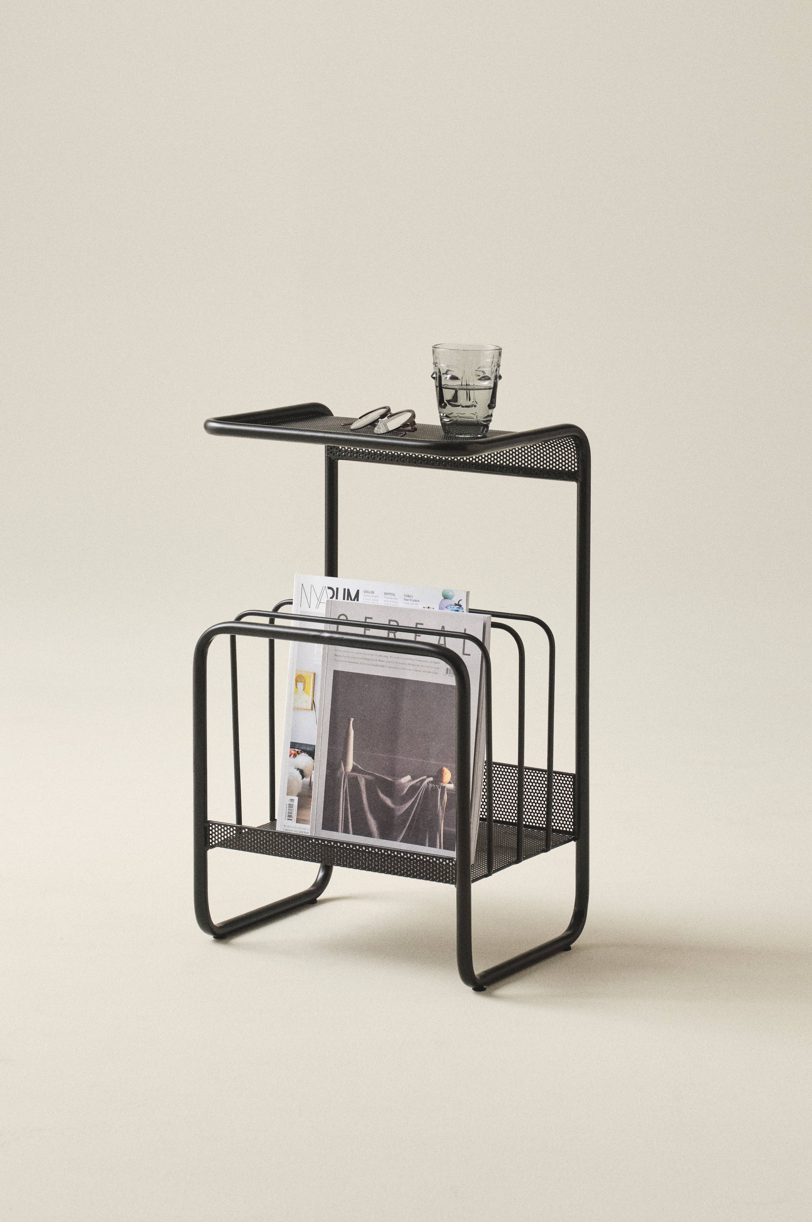 MAGDA on käytännöllinen rautainen lehtiteline, joka sopii hyvin myös sivupöydäksi suosikkinojatuolisi viereen. Pöytälevy ja pohja ovat ohutta rautapeltiä, jossa on lävistetty reikäkuvio. Laita alaosan neljään lokeroon lehdet ja kirjat ja pöytätasolle teekuppi, silmälasit ja muut tarvikkeet, jotka haluat helposti saatavillesi.