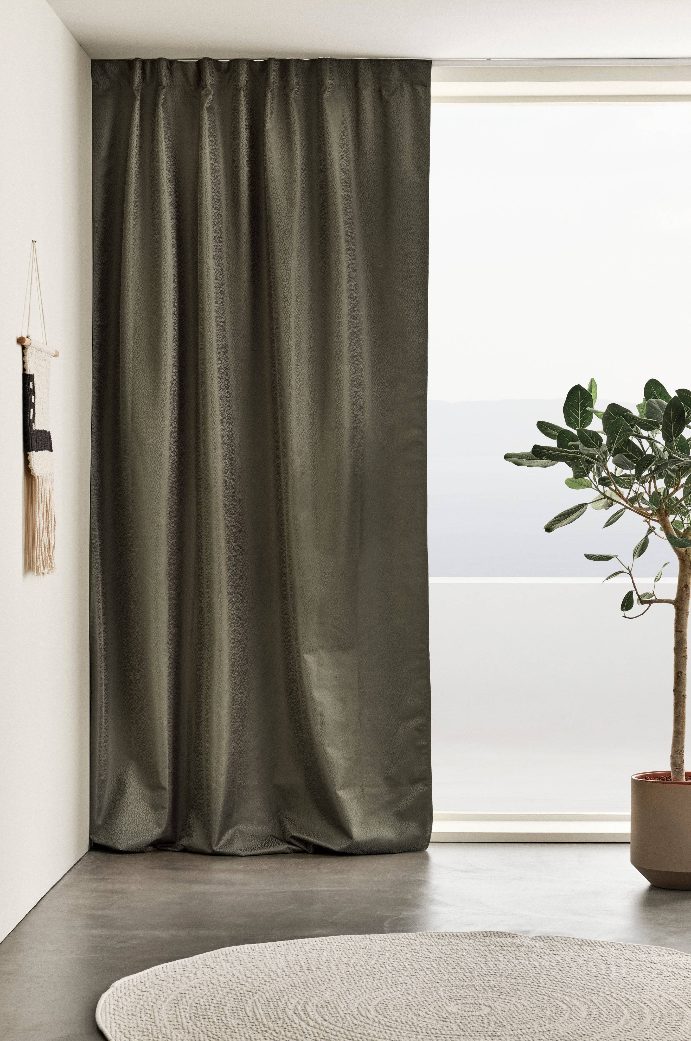 Pimentävä sivuverho (toiminnallinen verho) polyesteriä, josta puolet on kierrätettyä materiaalia. Kangas estää valon sisäänpääsyn ja pimentää makuuhuoneen, TV-huoneen tai lastenhuoneen. Sivuverhossa on hillitty, sointuva kuvio. Valon sisäänpääsyn estävä pinnoite takana. Verhossa on päälleommeltu monitoiminauha, ja se voidaan ripustaa sormikoukkujen, kujan tai piilolenkkien avulla.