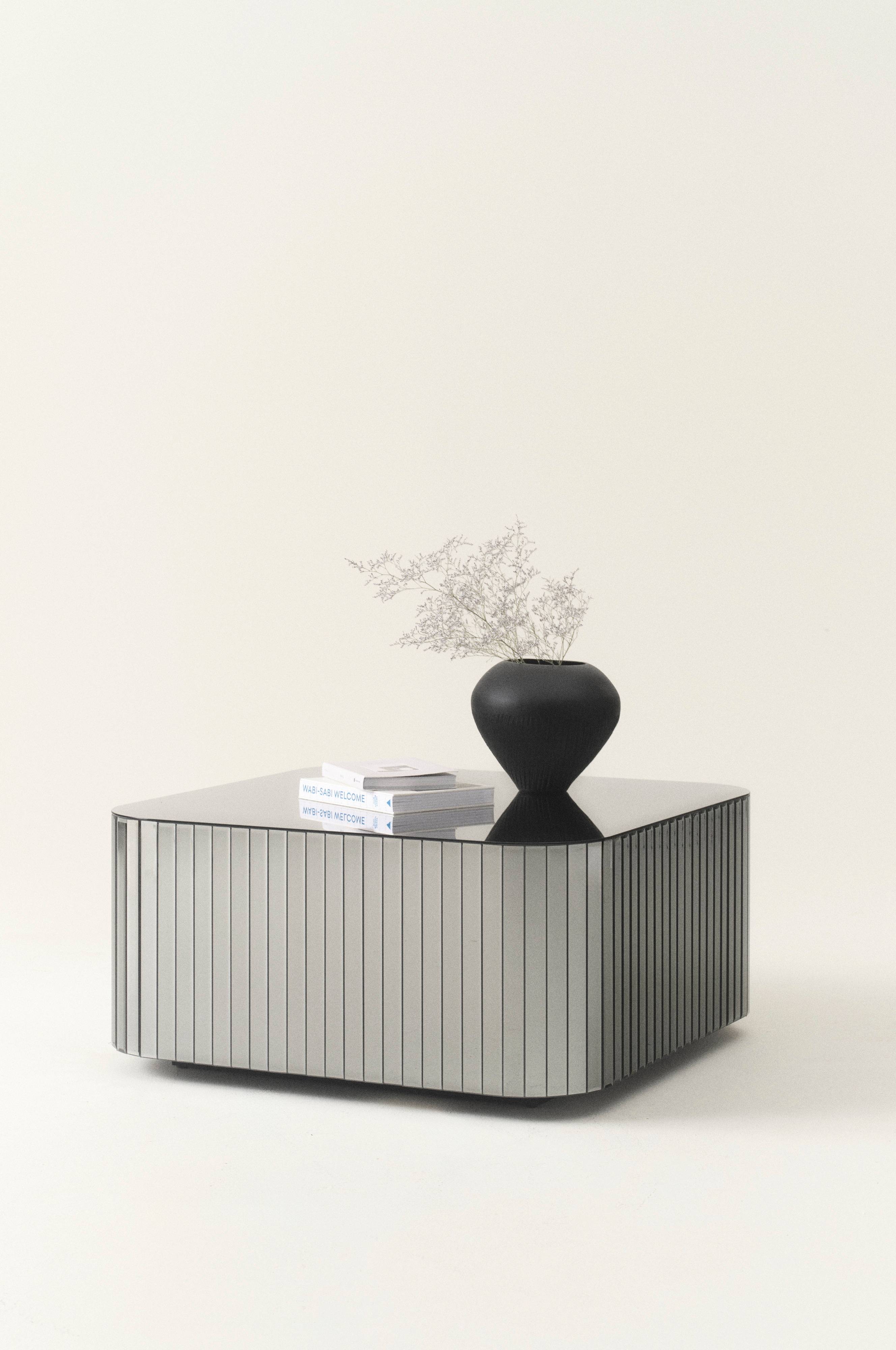 Neliönmuotoinen sohvapöytä, jossa pöytälevy ja ympärillä olevat pystypaneelit savunväristä lasia. Pöydässä on pyöristetyt kulmat ja sivulla olevissa lasipaneeleissa on viistetyt reunat. Runko FSC-merkittyä MDF-levyä.