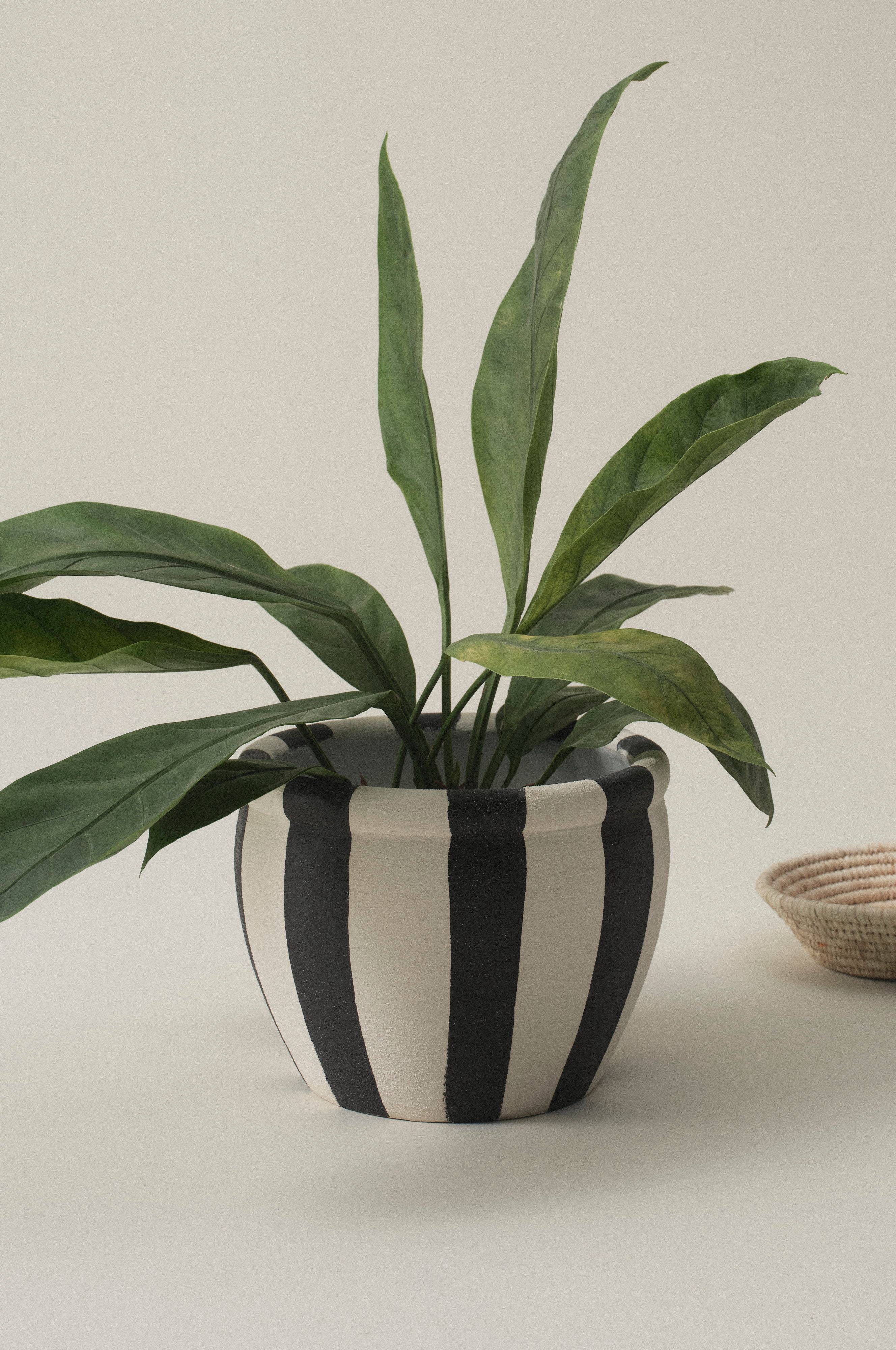 Käsintehty keramiikkaruukku, jossa lasitettu struktuuri ja pystysuorat leveät raidat. Sisäpuoli on sileä ja lasitettu. Huomaa, että keramiikka voi päästää kosteutta läpi.