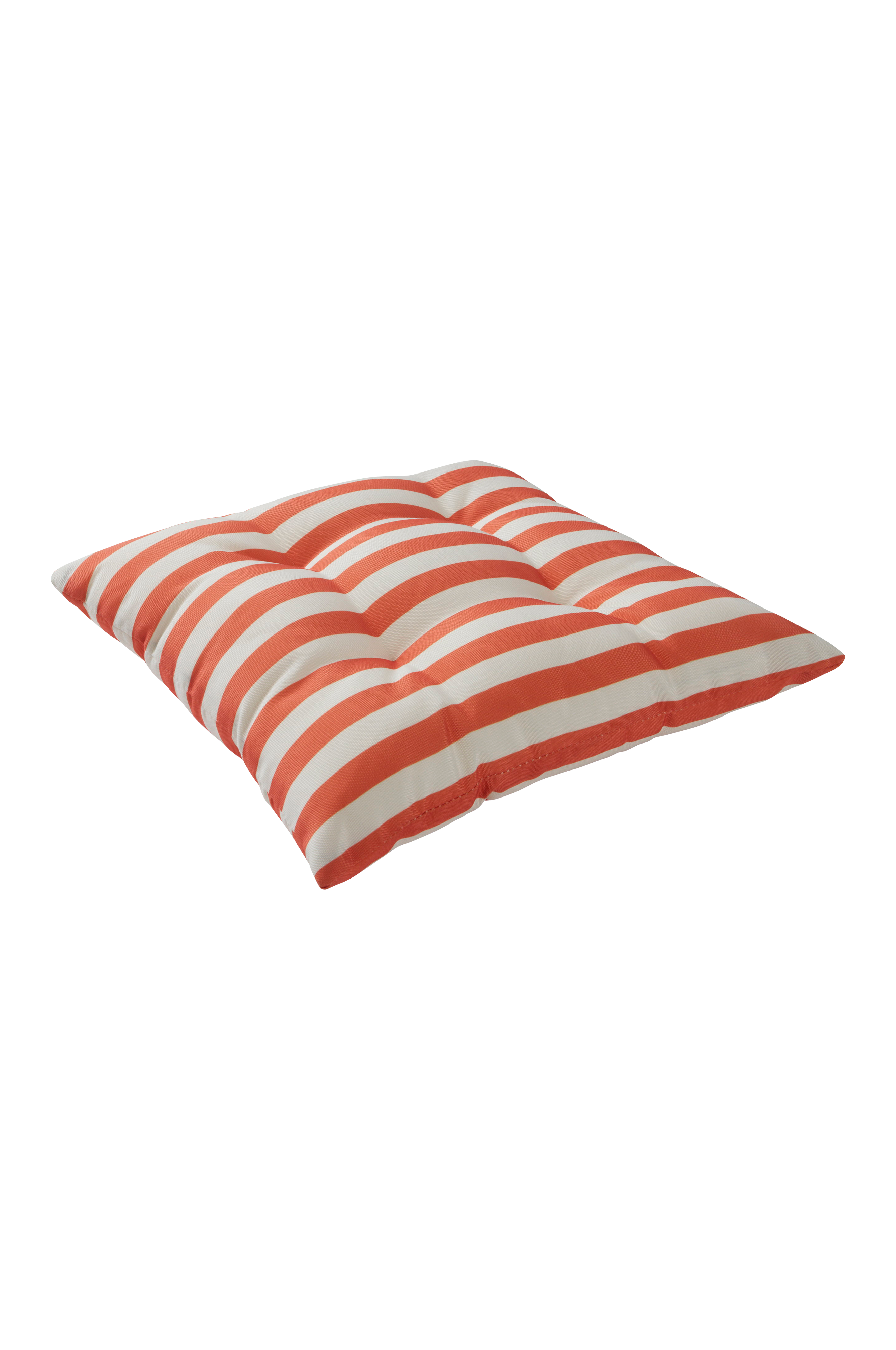 Raidallinen ulkokalusteiden istuintyyny. Kangas on polyesteriä, jossa on painettu kuvio ja vettä hylkivä pinnoite. Istuintyynyssä on vaahtotäyte. Päällistä ei voi irrottaa. Kankaan Martindale-arvo on 30 000.