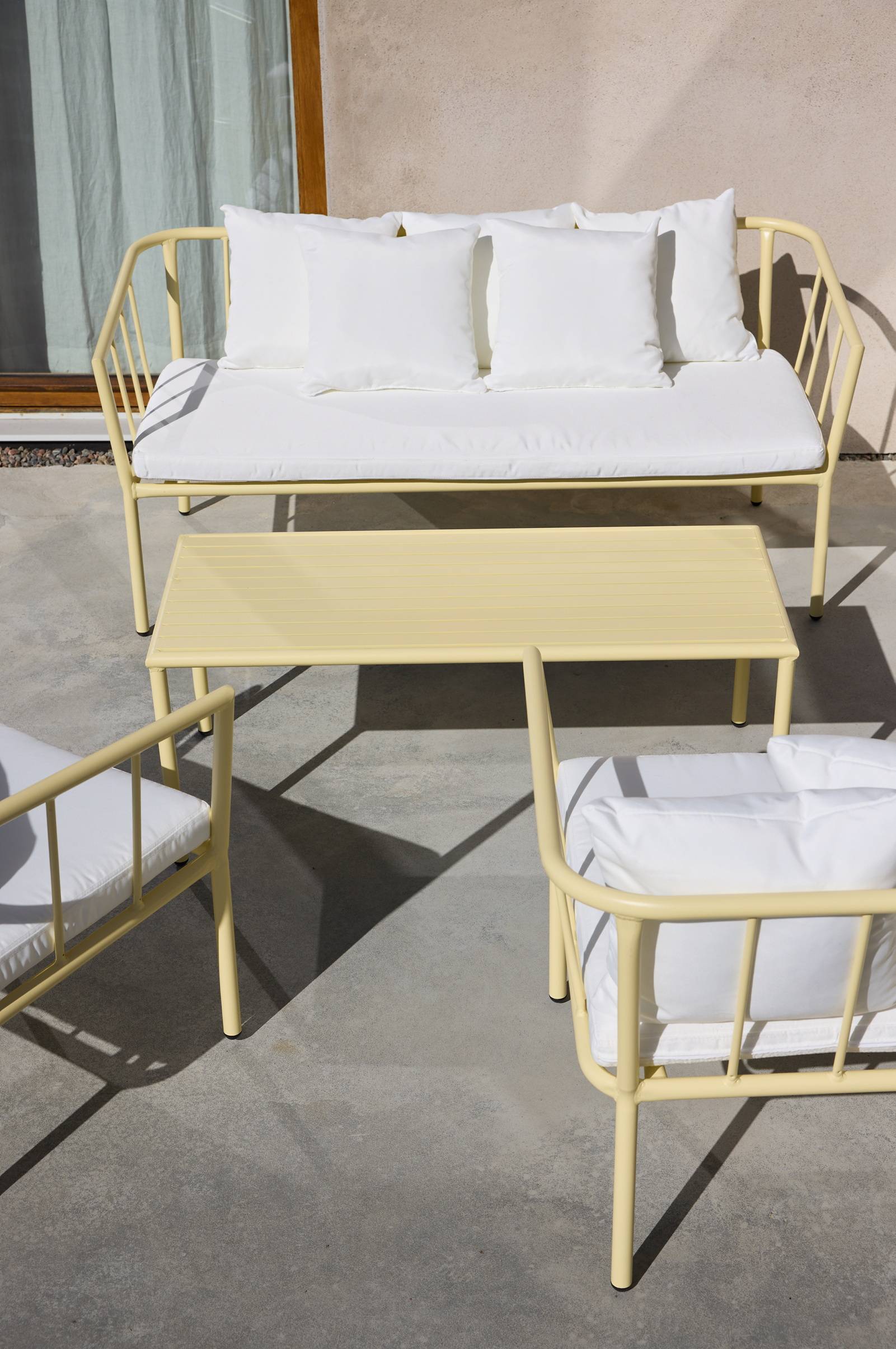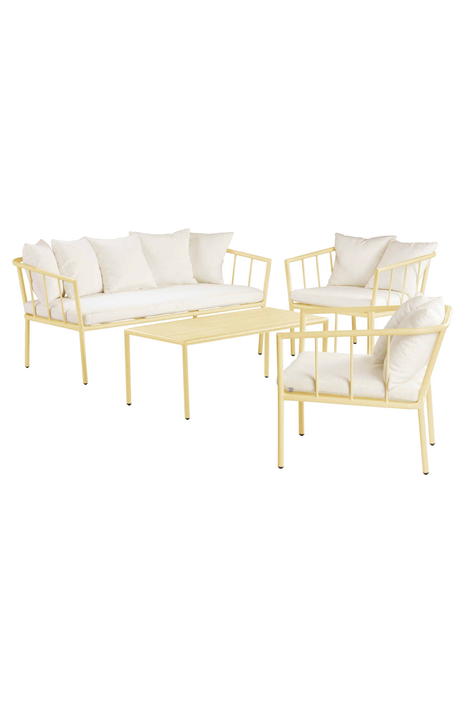 Loungekalusteet jauhemaalattua mattapintaista alumiinia, joka ei heijasta auringonvaloa. Neljä osaa. Loungeryhmään kuuluu kaksi nojatuolia, joissa kummassakin istuinpehmuste ja kaksi tyynyä, sohva, jossa istuinpehmuste ja viisi tyynyä sekä sohvapöytä. Istunpehmusteiden ja tyynyjen päällinen polyesteriä ja täyte vaahtomuovia. MENTON sopii ulkokäyttöön ja tekee ulkoelämästä helpompaa, sillä alumiini ei ruostu. Kalustetta ei tarvitse siirrellä sisälle ja ulos. Nojatuoli on siro, ja siinä on juuri oikeanlaista loungehenkeä. MENTON on helppo pinota säilytystä varten. Kevyt.