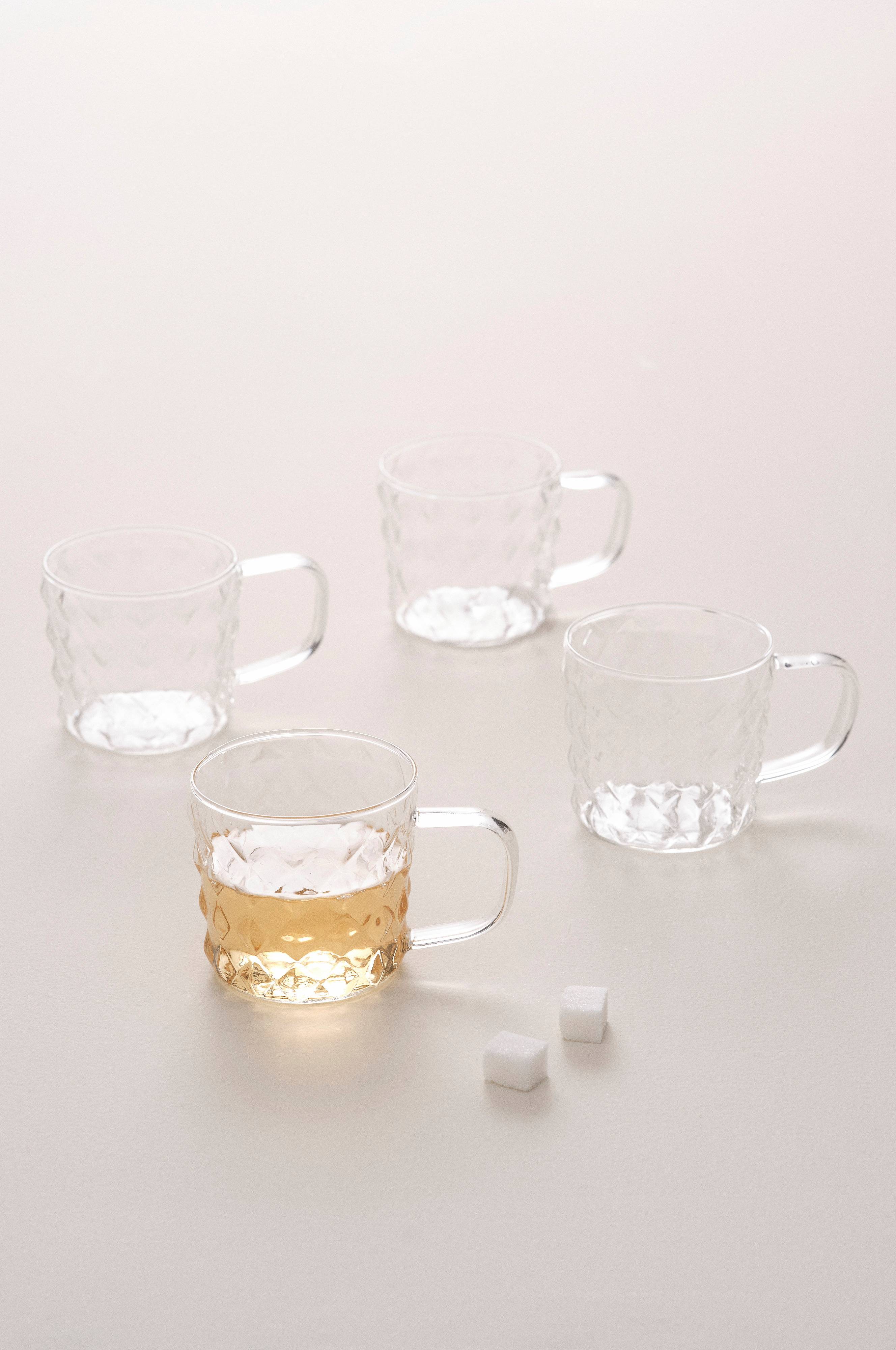 Lasiset mukit, 4/pakkaus. Mukeissa on hieno kohokuvio ja kahva, josta saa hyvän otteen. Kahva on kätevä silloin, kun mukissa on kuumaa juomaa.