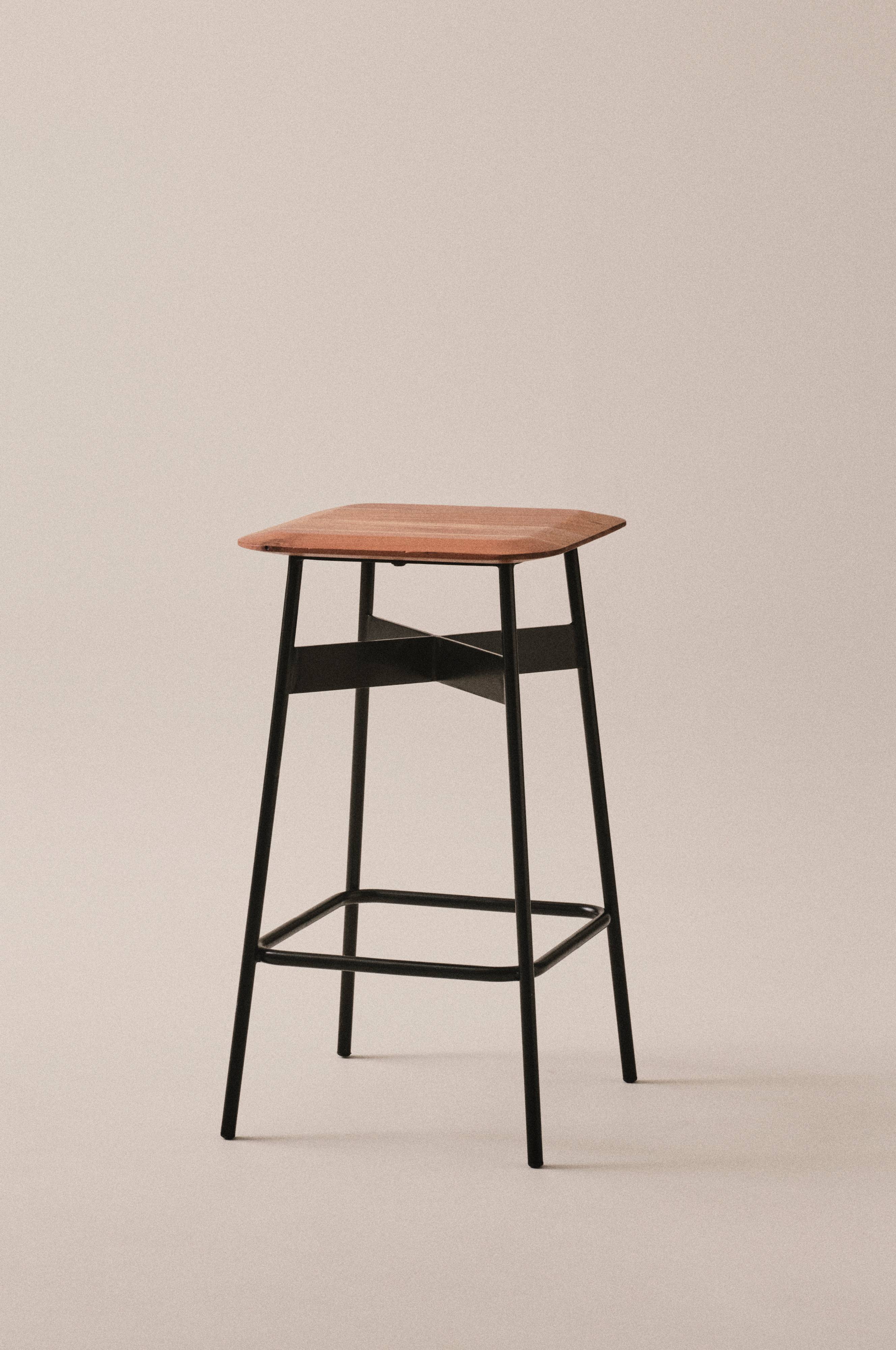 Baarijakkara, jossa tyylikäs muotoilu. Runko jauhemaalattua metallia, istuin akasiaa ja tuki jalkoja varten.