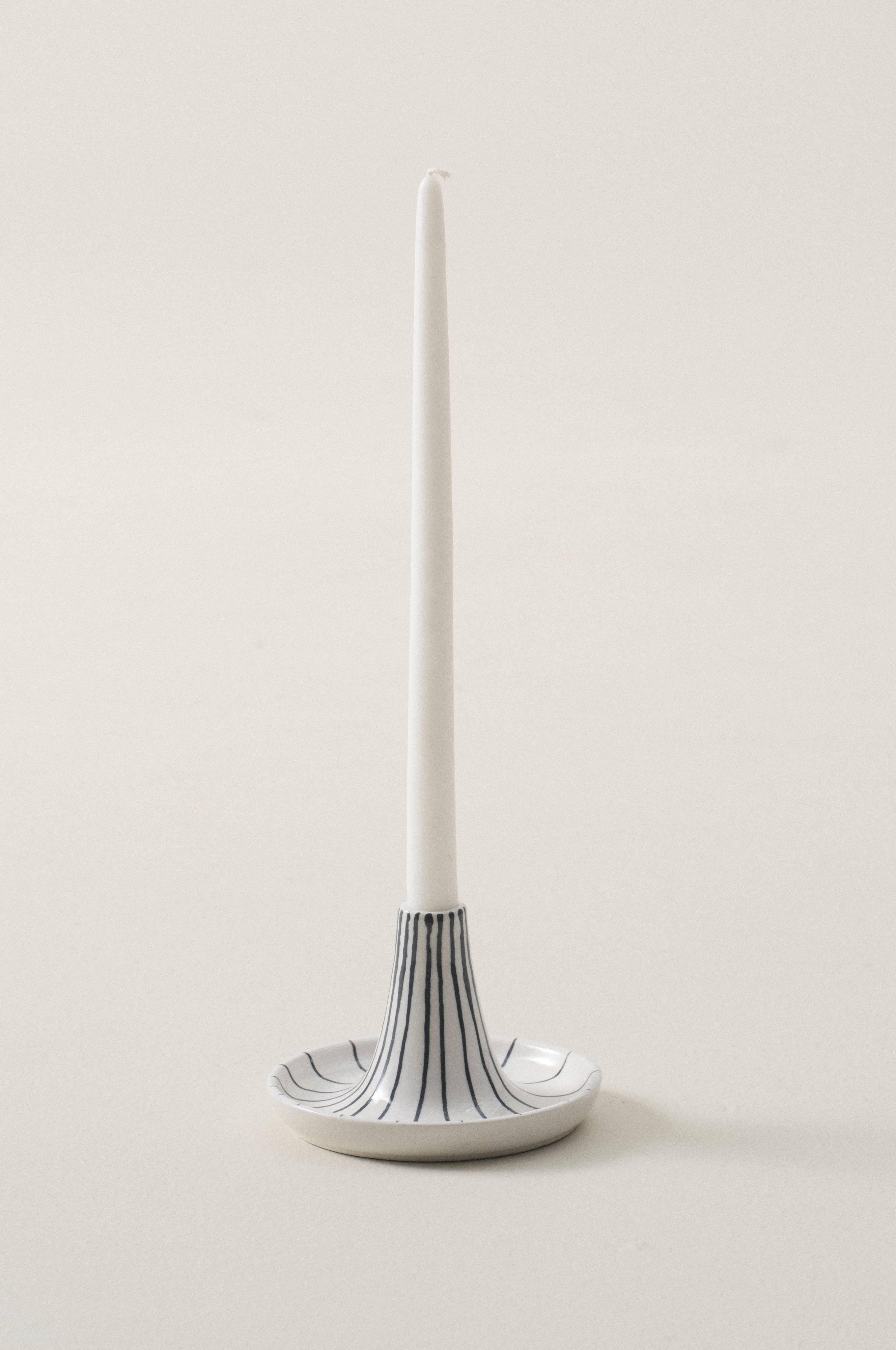 Käsintehty kynttilänjalka keramiikkaa. Klassisen muotoinen kynttilänjalka, jossa raikas raidallinen lasite. Kynttilänjalan muoto sopii erittäin hyvin kynttilöille, joilla on taipumus valua palaessaan. Valuva steariini kovettuu kauniisti kynttilää pitkin pienelle lautaselle sen sijaan, että se valuisi pöytäliinalle. Kynttilä ei sisälly toimitukseen.