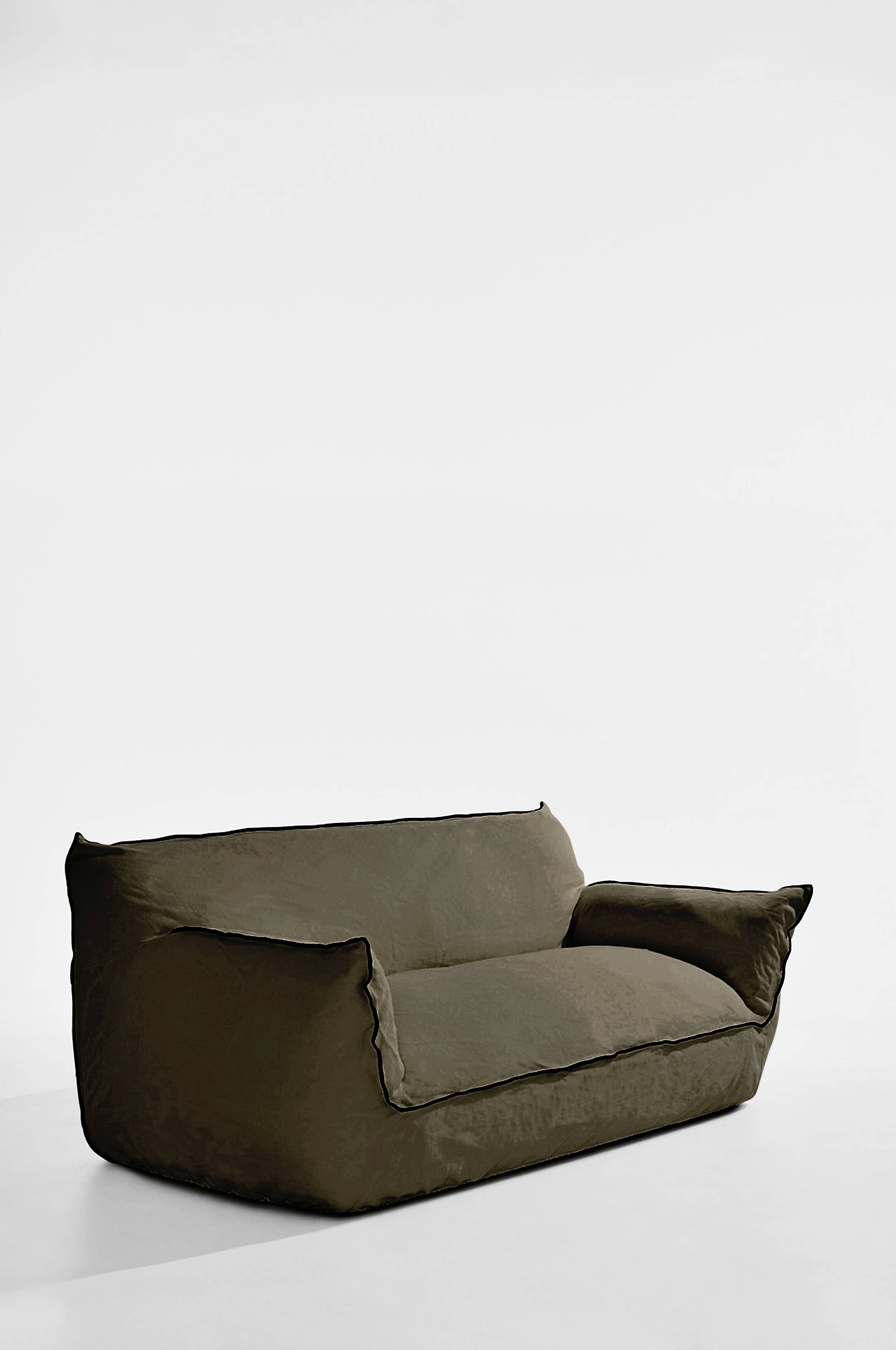 Gia on tilava sohva, jossa on mukava istua. Voit myös nostaa jalat ylös tai käpertyä mukavasti sohvannurkkaan. Irrotettava päällinen on 100% pellavaa, ja siinä on miellyttävän väljä istuvuus. Voidaan pyyhkiä märällä liinalla. Päällisen taustapuoli on vahvistettu, mikä parantaa kestävyyttä. Overlock-saumat antavat huonekalulle luonnetta, ja miellyttävä untuvatäyte tuo mieleen untuvatyynyn. Runko on FSC-sertifioitua mäntyä ja FSC-sertifioitua vaneria. Niitä yhdistää siksak-jousitus ja joustavat nauhat, jotka tekevät sohvasta mukavan istua. Pehmuste koostuu polyesterivaahdosta ja untuvatäytteestä, joka on kuin piste i:n päällä.