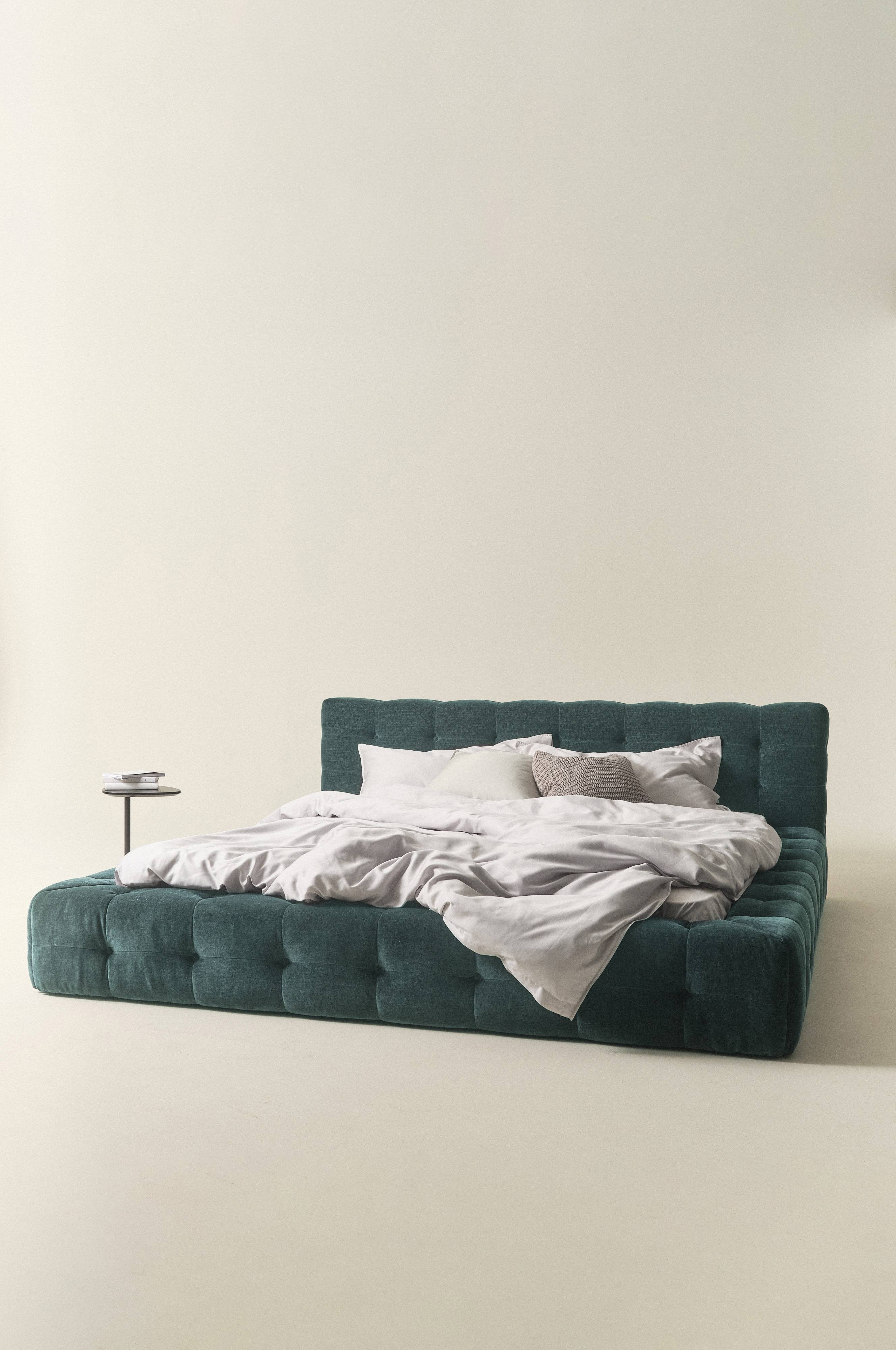 Tämä sängyn runko on ihanan kutsuva ja muodoltaan erittäin avara. Sekä sängyn pääty että sitä ympäröivä runko on pehmeästi pehmustettu ja verhoiltu pehmeällä polyesterisienillikankaalla, jossa on syvälle pistetyt napit. Sänky on ylellinen ja tyylikäs. Sänkyä ympäröivä runko ulottuu lähes kokonaan lattiaan asti, jättäen vain pienen ilmaraon, jonka ansiosta ilma pääsee kiertämään sängyn alla. Runko on valmistettu FSC-sertifioidusta männystä ja vanerista. Sängyn kehyksessä on vanerinen sälepohja, ja voit lisätä siihen patjat tai jousipatjat mieltymyksesi mukaan.