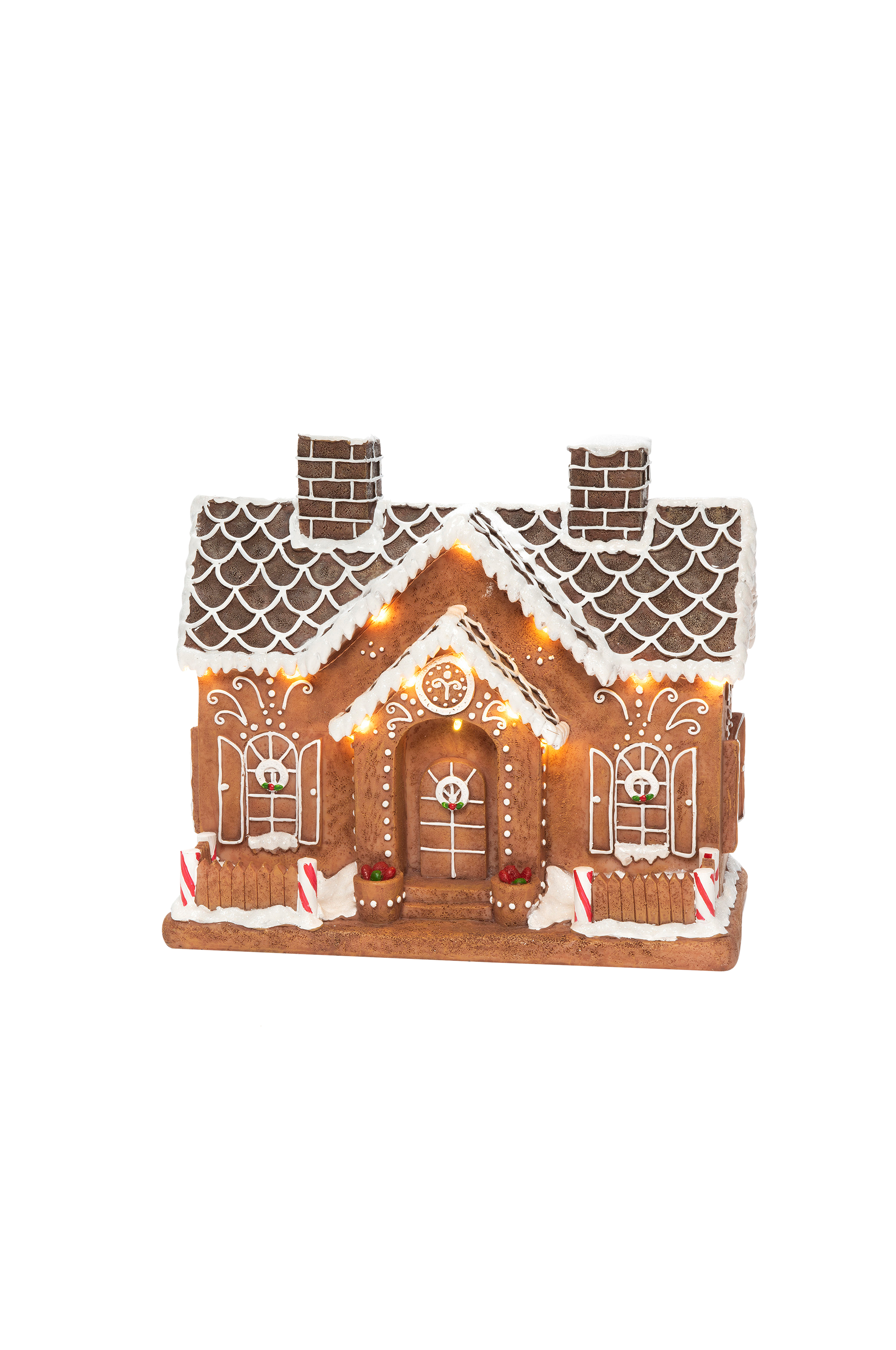 Piparkakkutalo valokuitua. Toimii 4,5 voltin muuntajalla tai kolmella AA-paristolla. Liitäntäjohto 1,8 metriä. Korkeus 21 cm, leveys 25 cm.