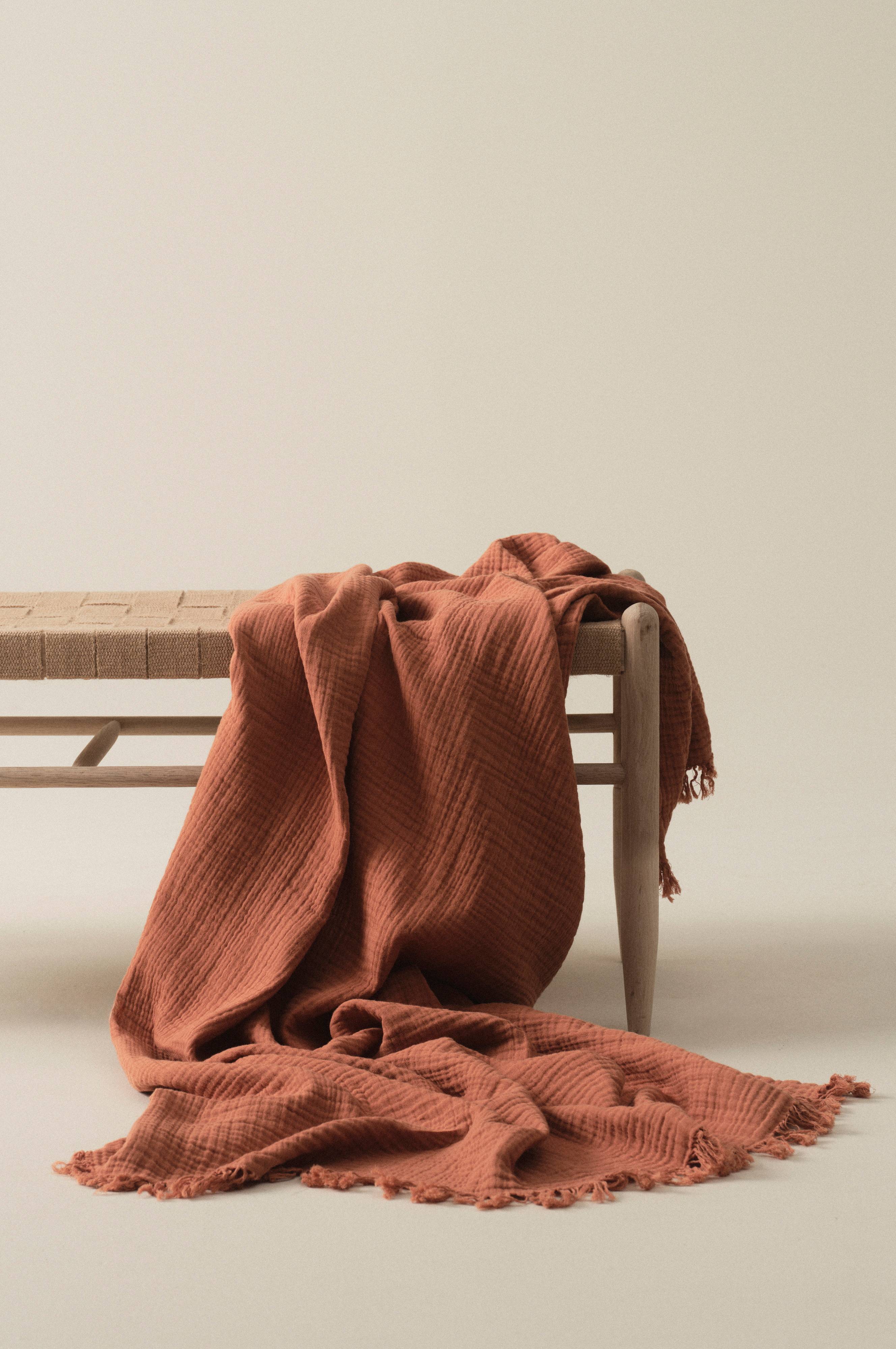 Yksivärinen torkkupeitto puuvillaa. Pehmeä ja hieman kuplapintainen torkkupeitto tuntuu ilmavalta ja viileältä. Puuvillakangas on entsyymipesty, jotta siihen on saatu miellyttävä ja hieman kulunut tuntu. Ihanan pörröiset hapsut lyhyillä sivuilla.