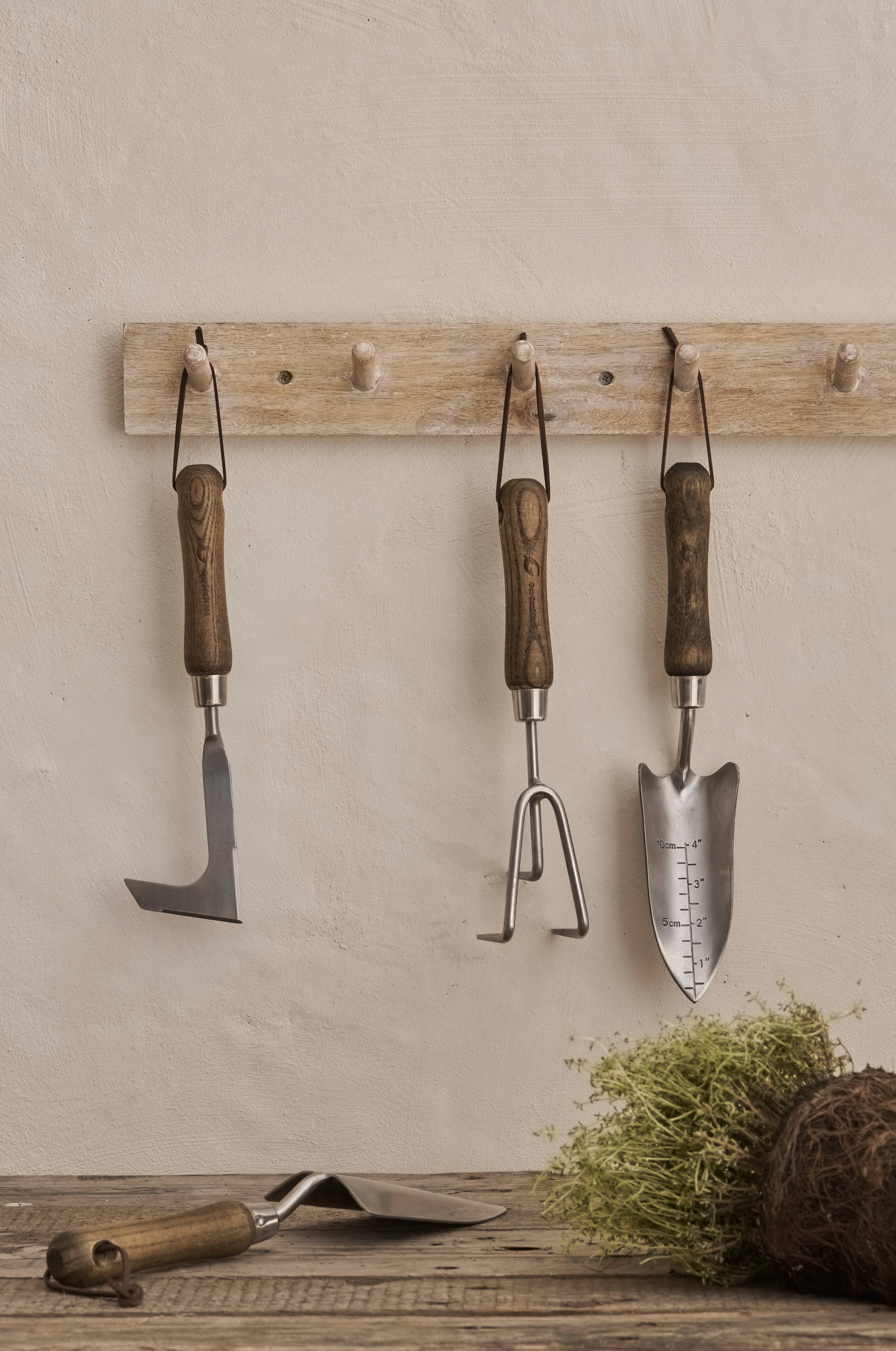 Puhdistusrauta, ruostumaton teräs, pituus 28,5 cm. Kuokka, ruostumaton teräs, pituus 32 cm. Möyhennyskuokka, ruostumaton teräs, 28 cm. Kuokka, ruostumaton teräs, 32,5 cm.